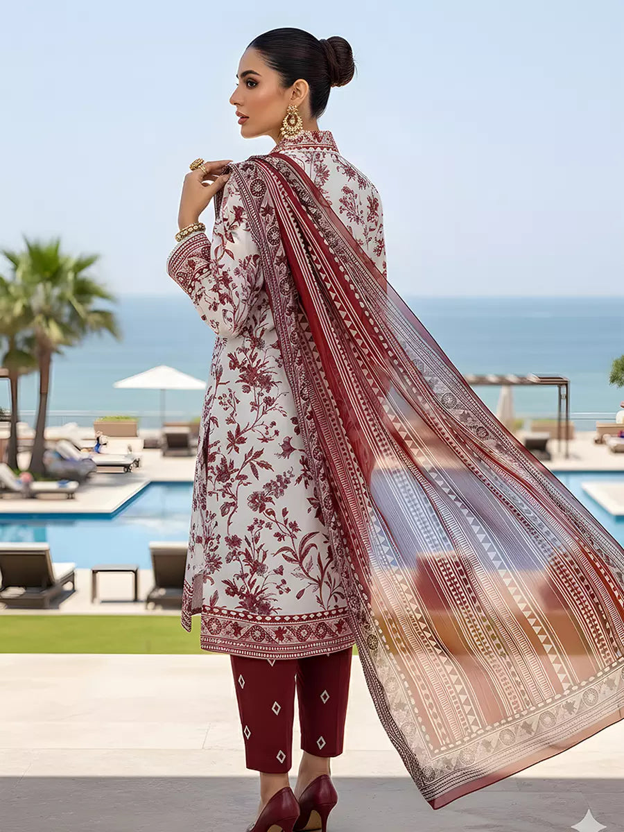 Elegant 3-piece suit in premium printed lawn silk. Includes a breathable shirt, trousers, and a lightweight dupatta. Perfect for any occasion.