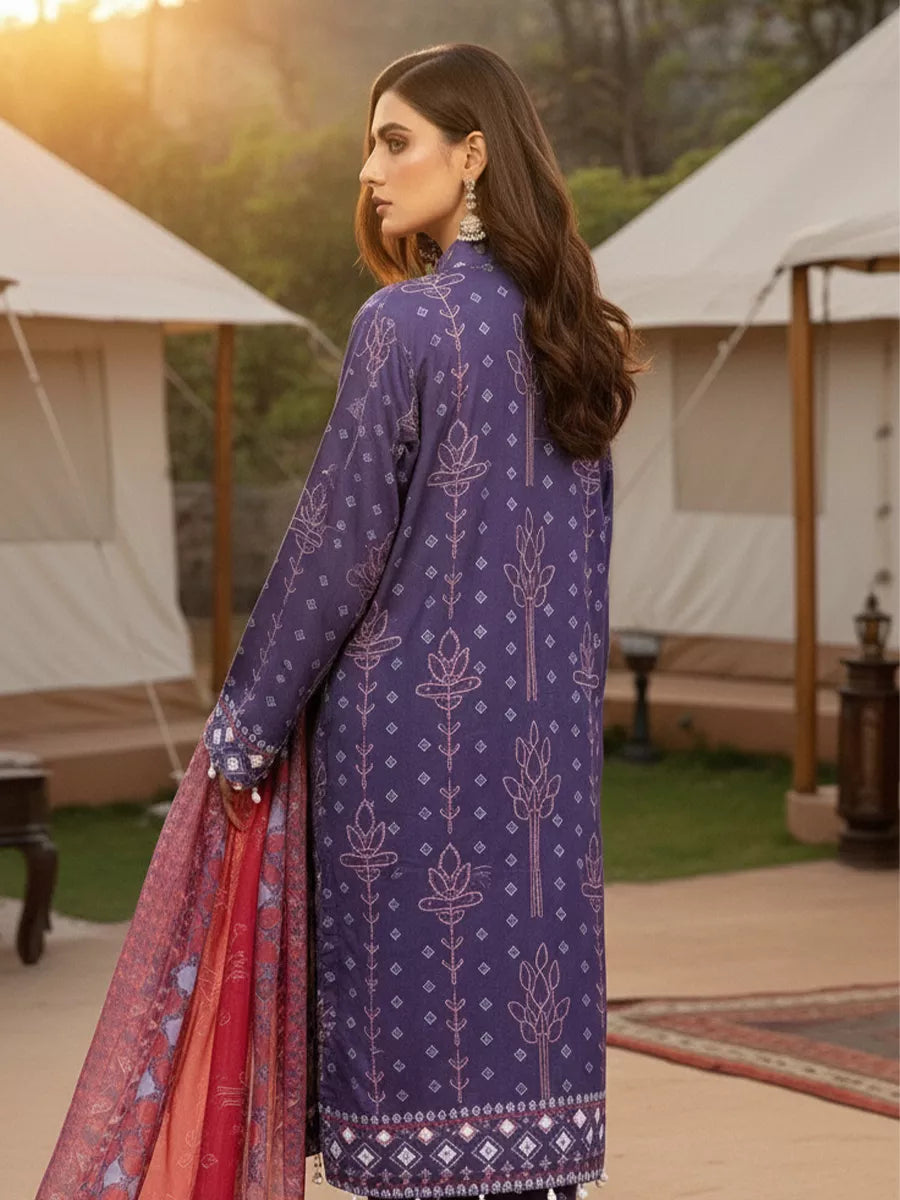 Elegant 3-piece suit in premium printed lawn silk. Includes a breathable shirt, trousers, and a lightweight dupatta. Perfect for any occasion.