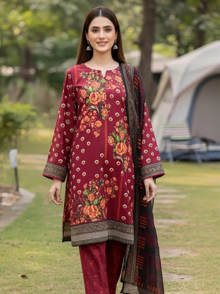 Elegant 3-piece suit in premium printed lawn silk. Includes a breathable shirt, trousers, and a lightweight dupatta. Perfect for any occasion.