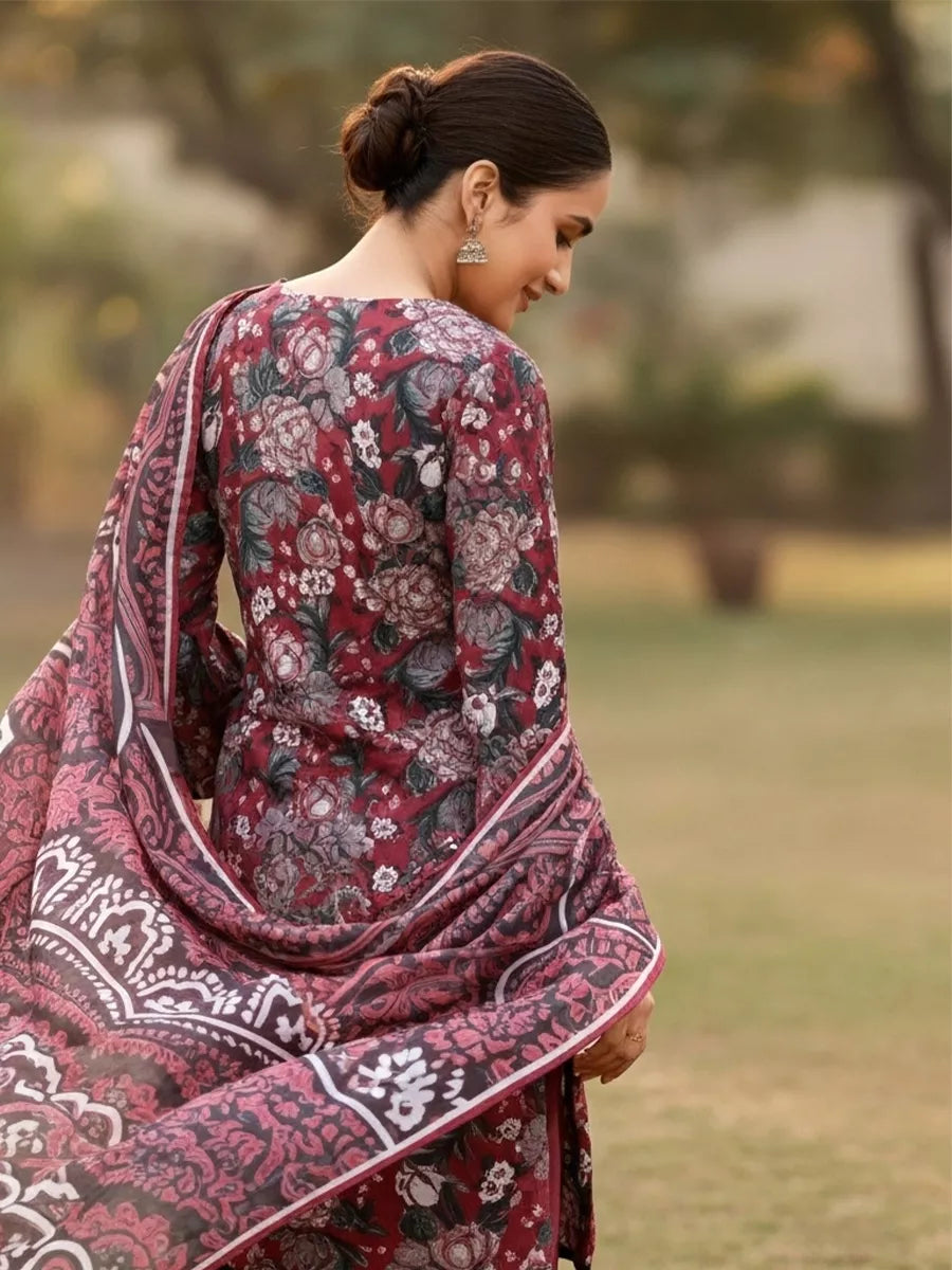 Elegant 3-piece suit in premium printed lawn silk. Includes a breathable shirt, trousers, and a lightweight dupatta. Perfect for any occasion.