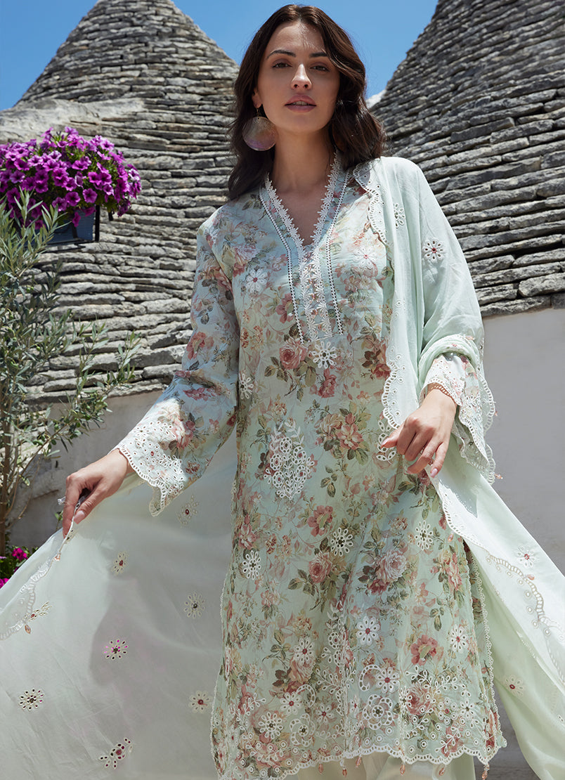 Schiffli-embroidered sleeves, daaman and pant