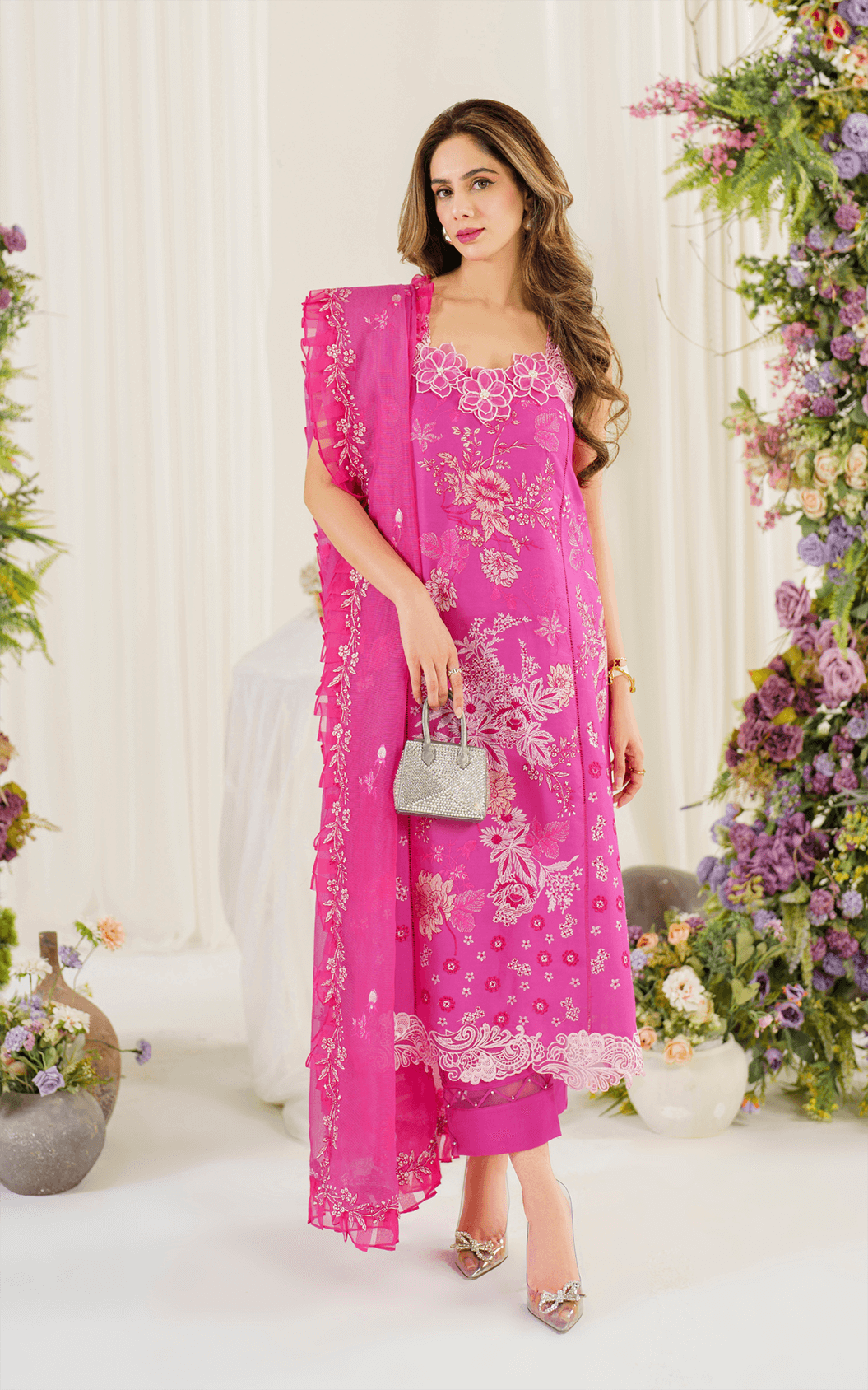 - Embroidered daman border for front and back on organza.