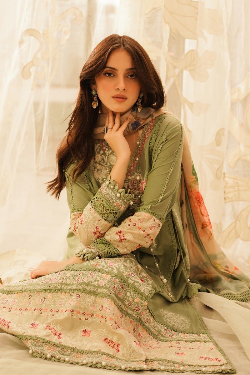A summer state of affair on a fern canvas. Featuring an embroidered silhouette, translated through the use of chinese floral imagery. Finishing off the look with printed silk dupatta and cotton pants,resonating in hues of fern and beige.