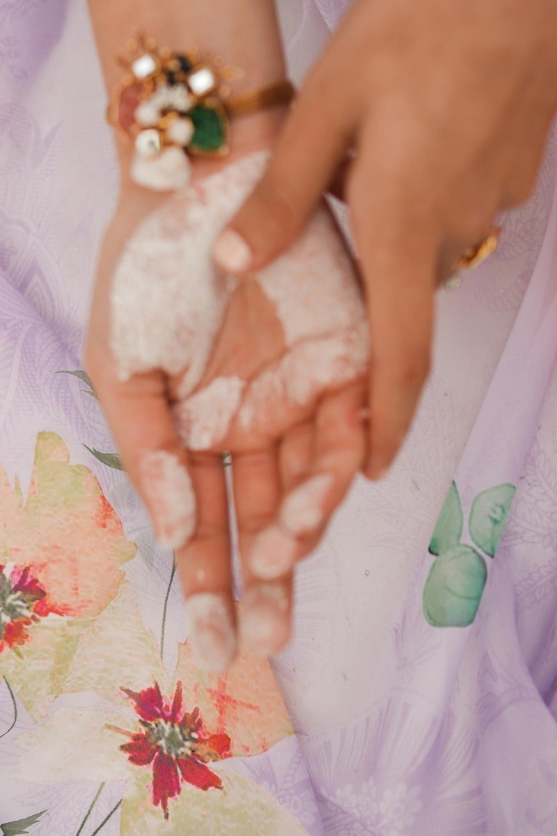 A masterpiece evocative of european wedding style on a daisy white canvas. The alluring cotton pants are complemented with a lilac silk dupatta which is layered with botanical prints that blossom like the gardens of spring.