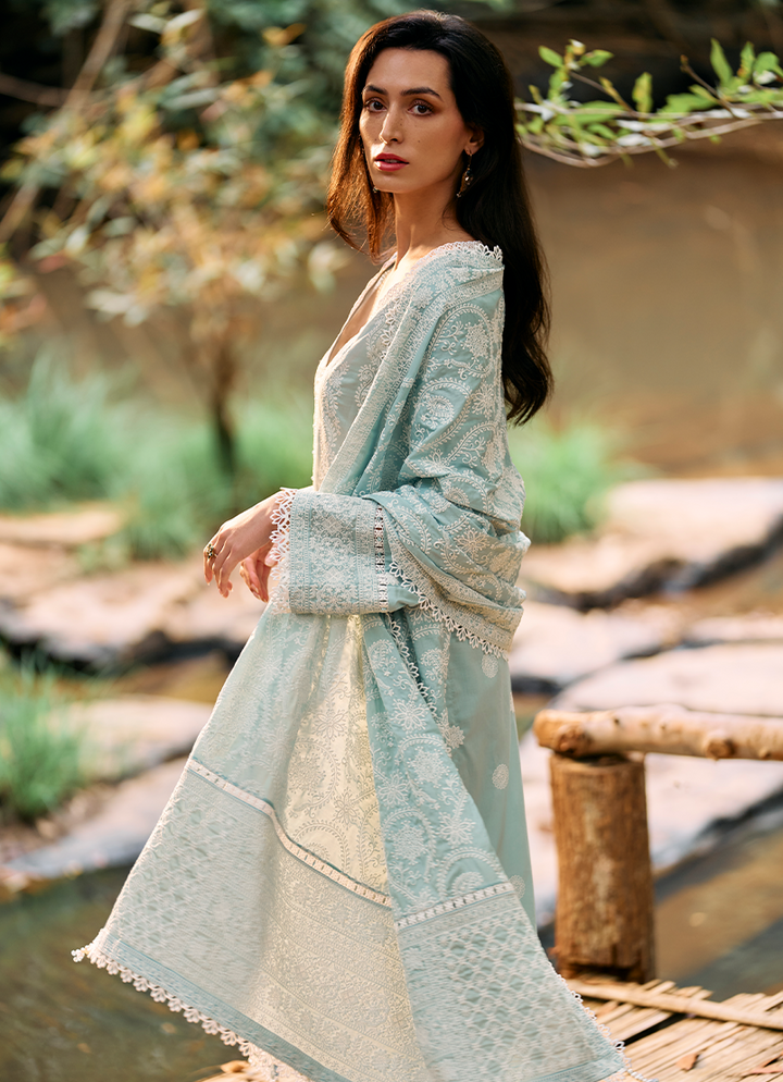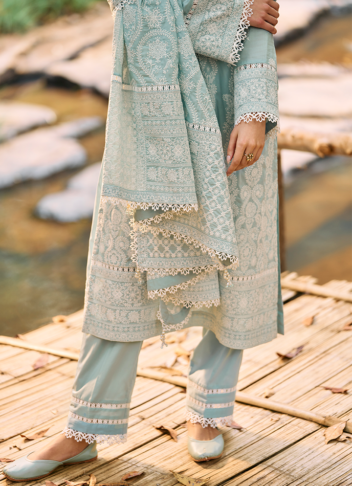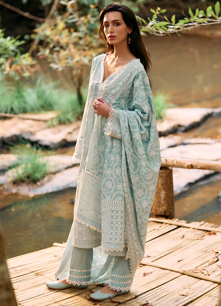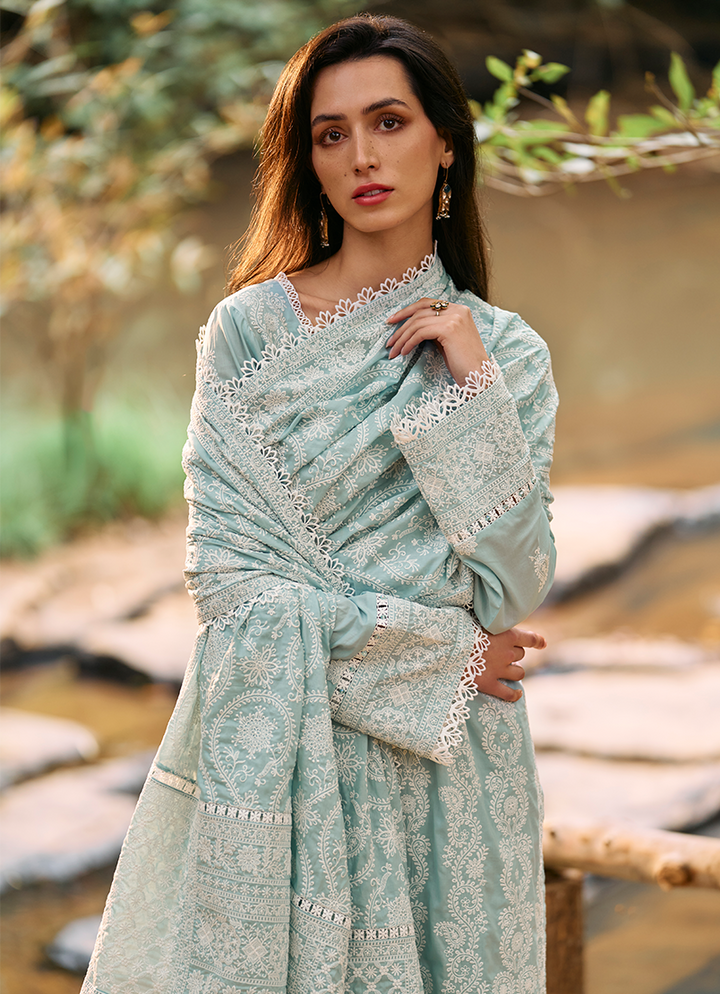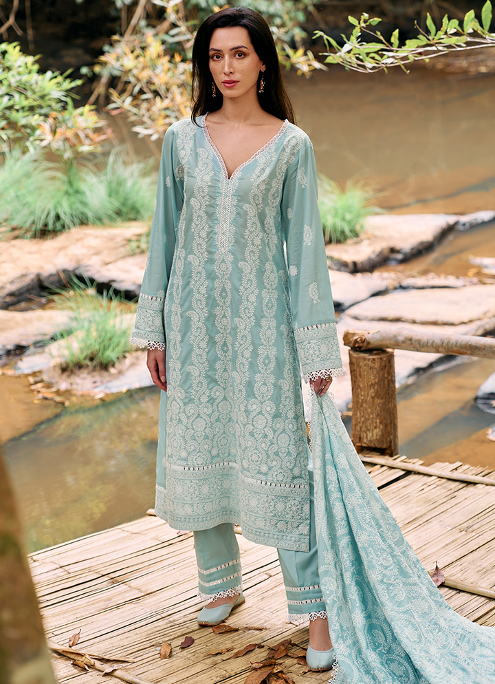 Three Piece Embroidered Suit With Embroidered Voile Dupatta