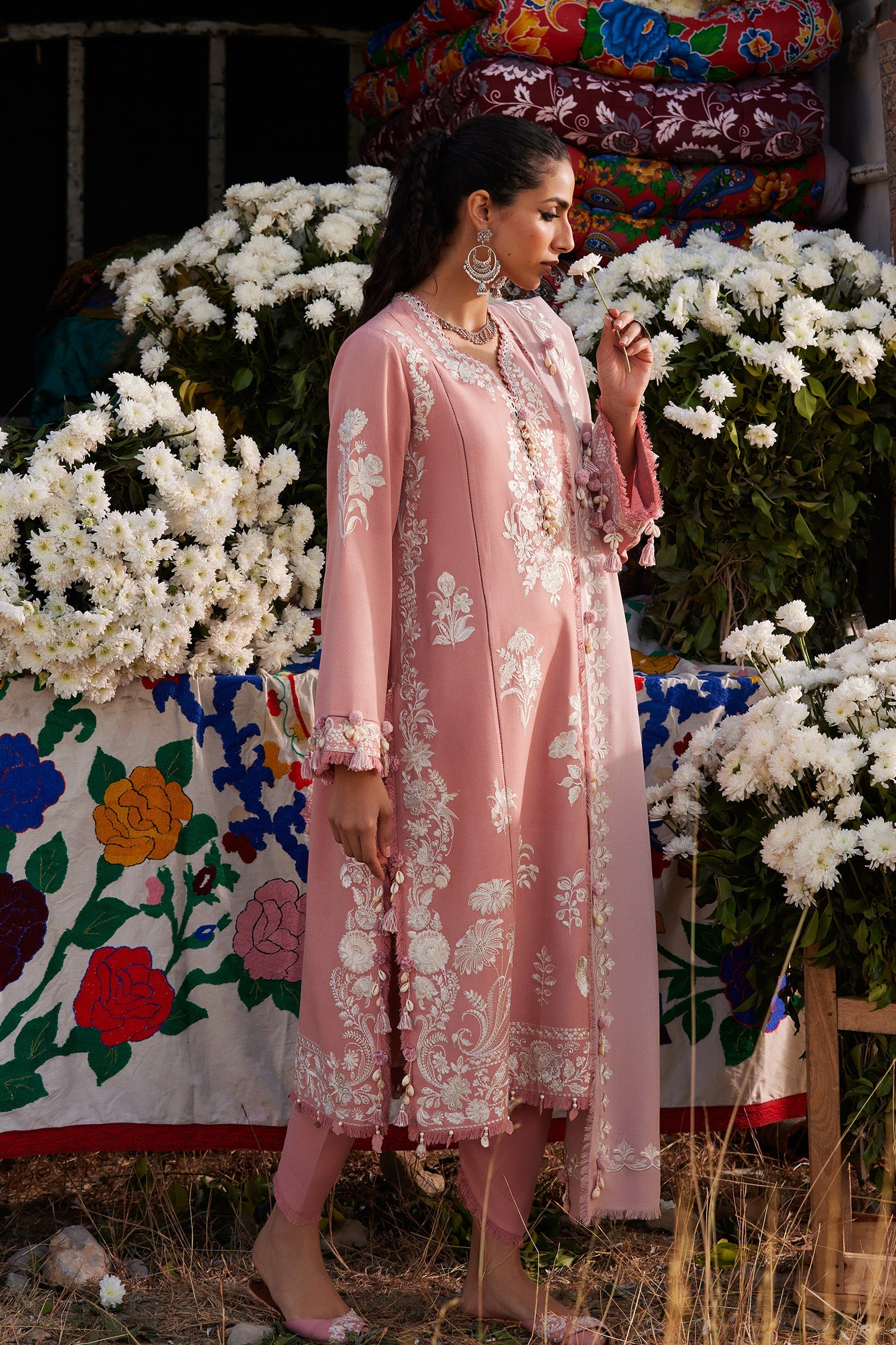 *Nira* — Woven on premium winter karandi, this soft rose ensemble exudes warmth, refinement, and quiet femininity. The fabric’s natural texture gives the outfit a rich, grounded feel, while the delicate ivory florals unfurl across the shirt like hand-painted winter blooms. Subtle threadwork, airy vines, and thoughtfully placed motifs add depth and movement, creating a soft yet striking visual story. Finished with graceful borders and a serene palette, *Raina* embodies an elegant winter mood — gentle, poetic, and beautifully crafted for the woman who loves understated luxury.