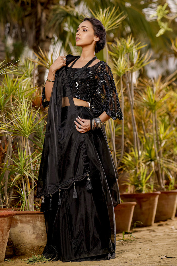- Solid black organza saree having cutwork and tassels on pallu.