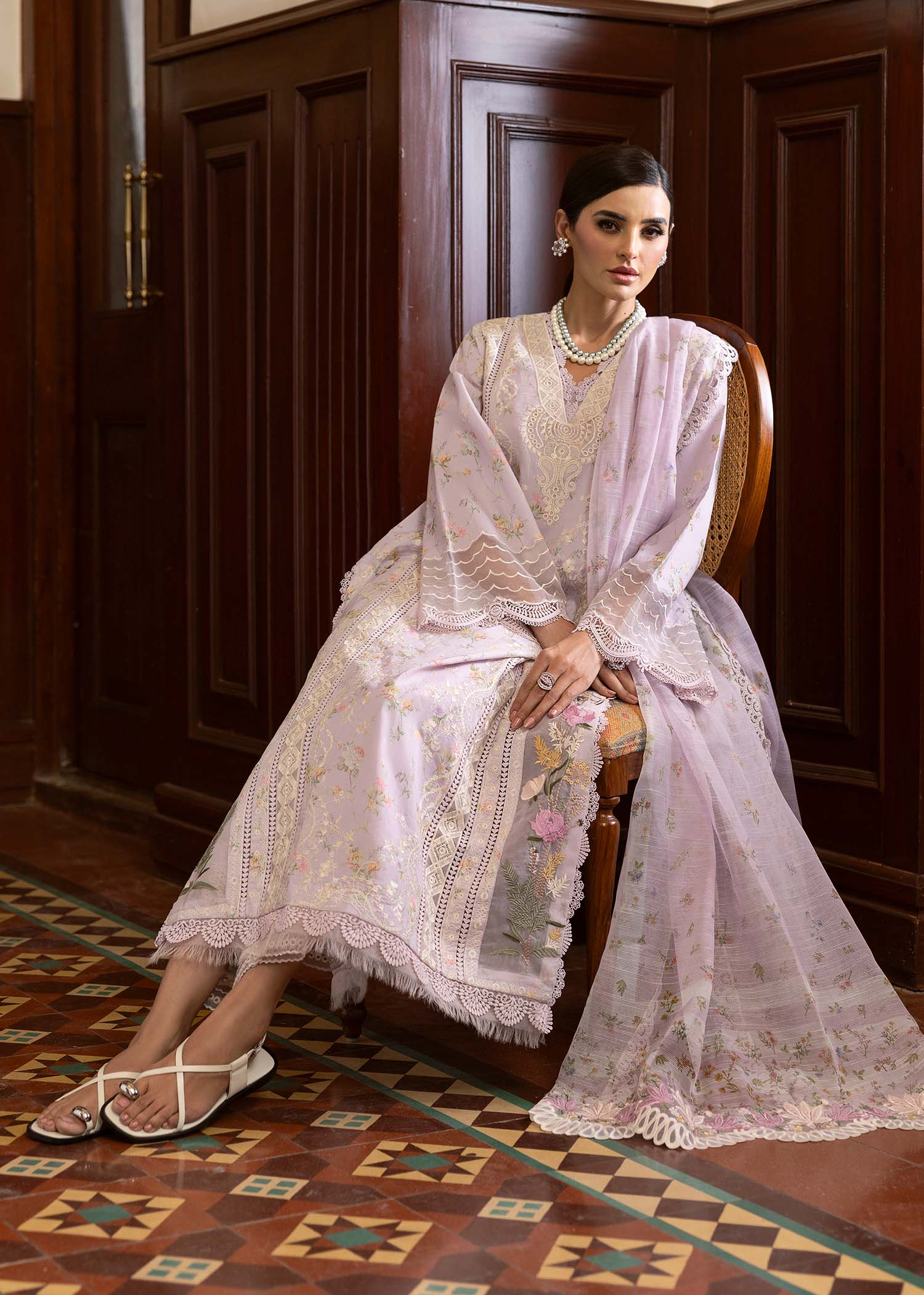 A design that redefines minimalist luxury. The panels are crafted on a refined printed canvas in the softest shade of lavender. The centre panel is framed with an embroidered border cascading ,flowy and intricate. A micro panel embroidered on organza and a side panel framed with beautifully detailed ghara floral motifs in pinks and sages. This design is a delicate fusion of elegance and artistry, where every thread tells a story of beauty. The pants are finished with chicken embroidery on organza. The duppatta is printed with pallus finished in gorgeous floral motifs in dori like scallops.