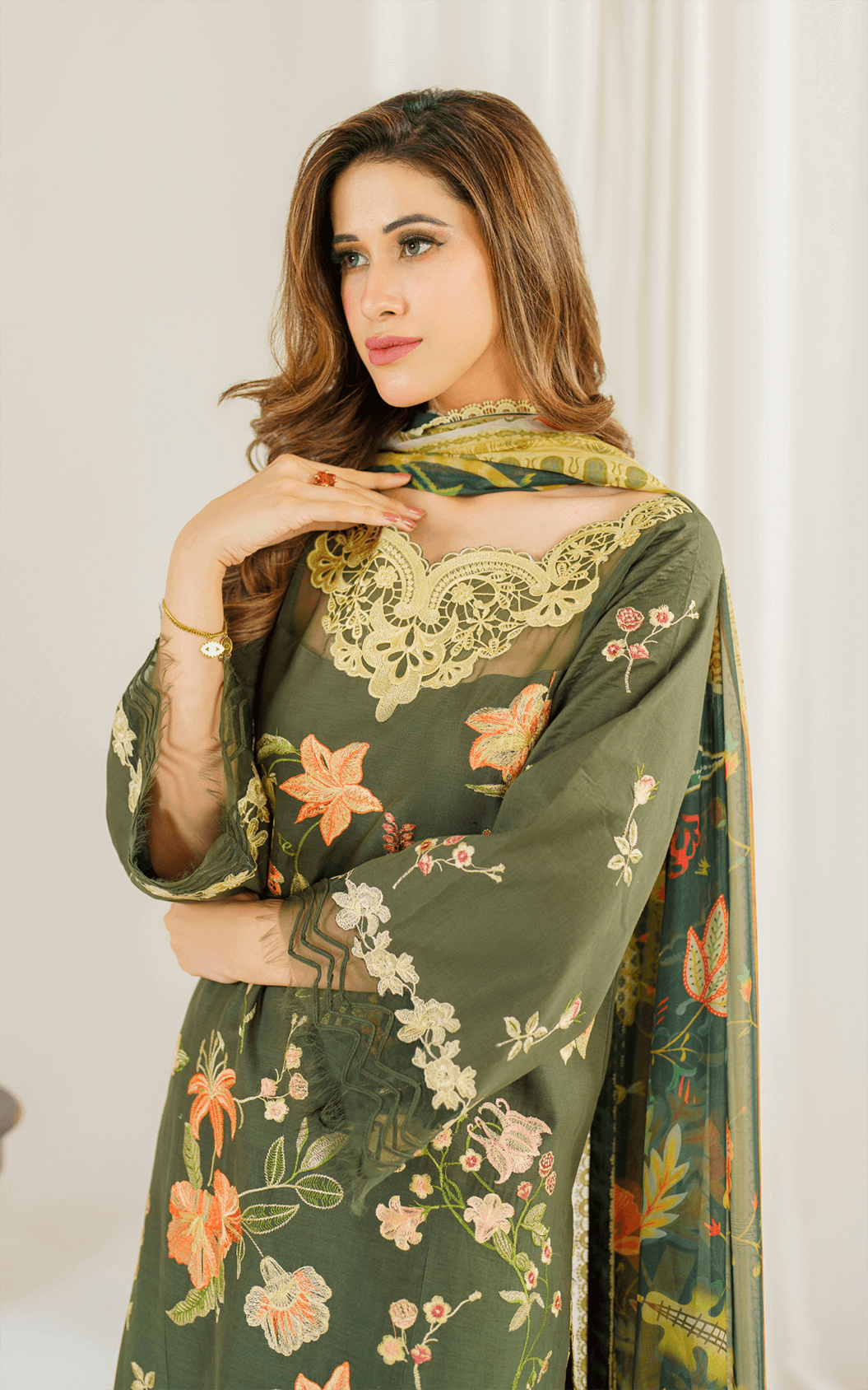 - Fully embroidered (boring work) left/right & center panel on dyed lawn.