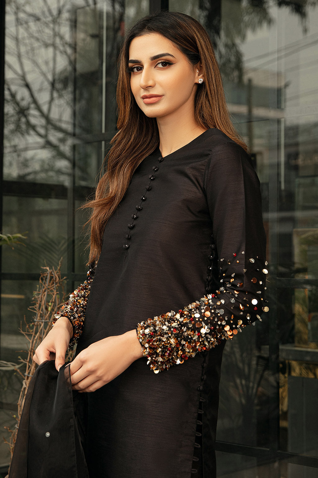 - An Exquisite Black Straight Shirt With Buttoned Detailed On The Front & Heavily Embellished Sleeves Paired With short Length Trouser & Organza Dupatta (Adda Work & Embroidery On Shirt)