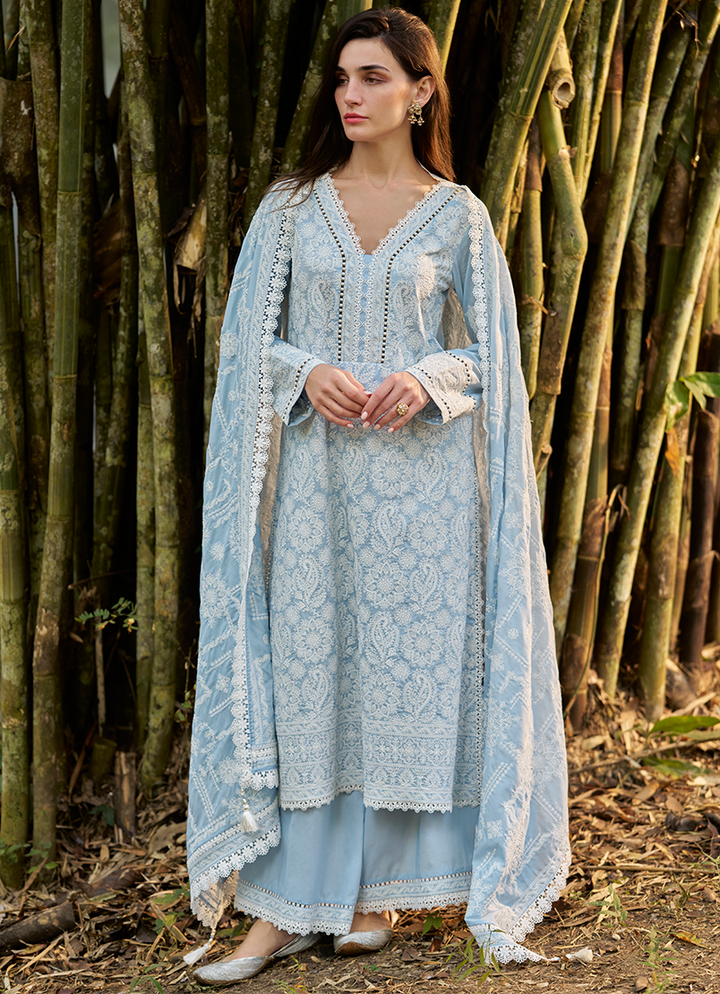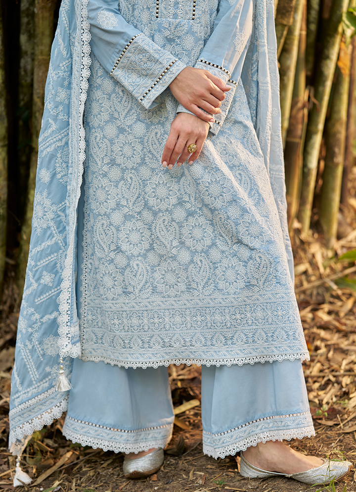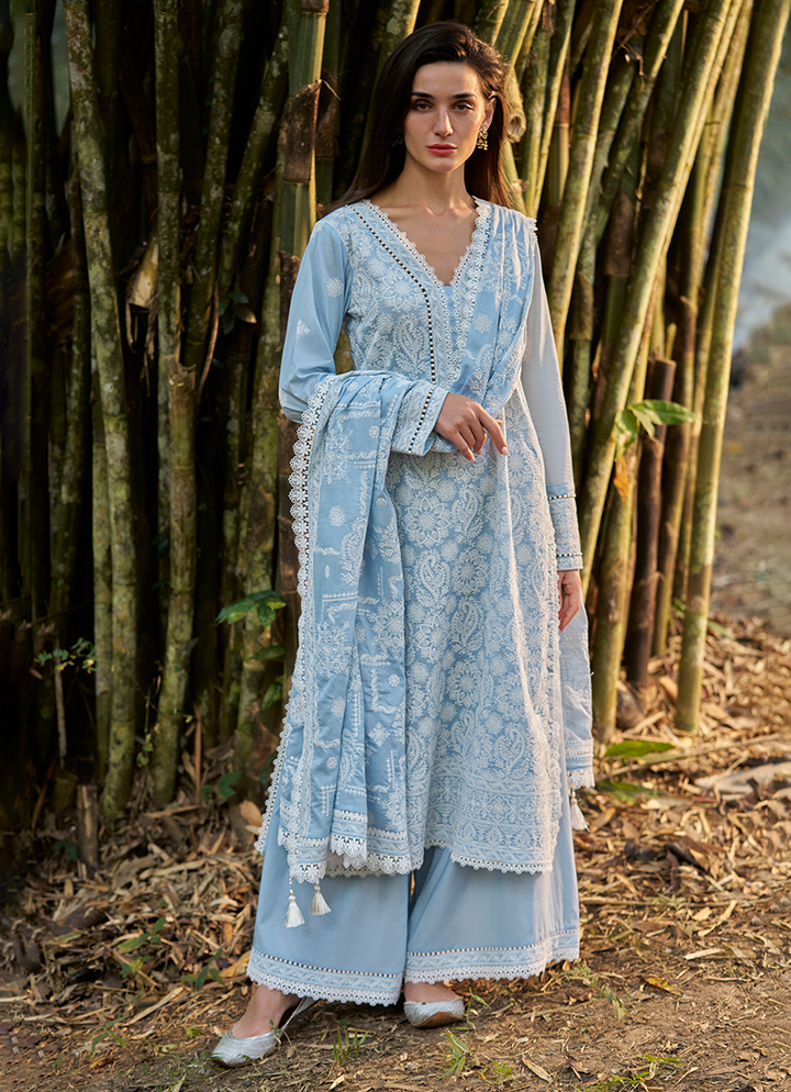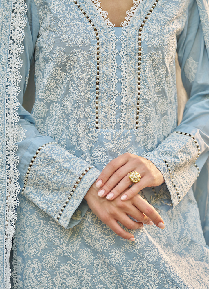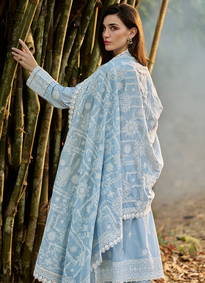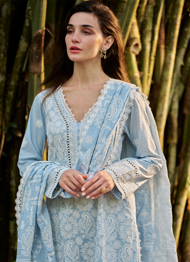 Three Piece Embroidered Suit With Embroidered Voile Dupatta