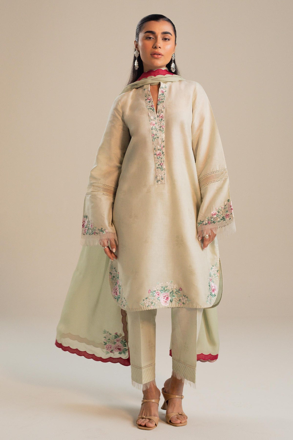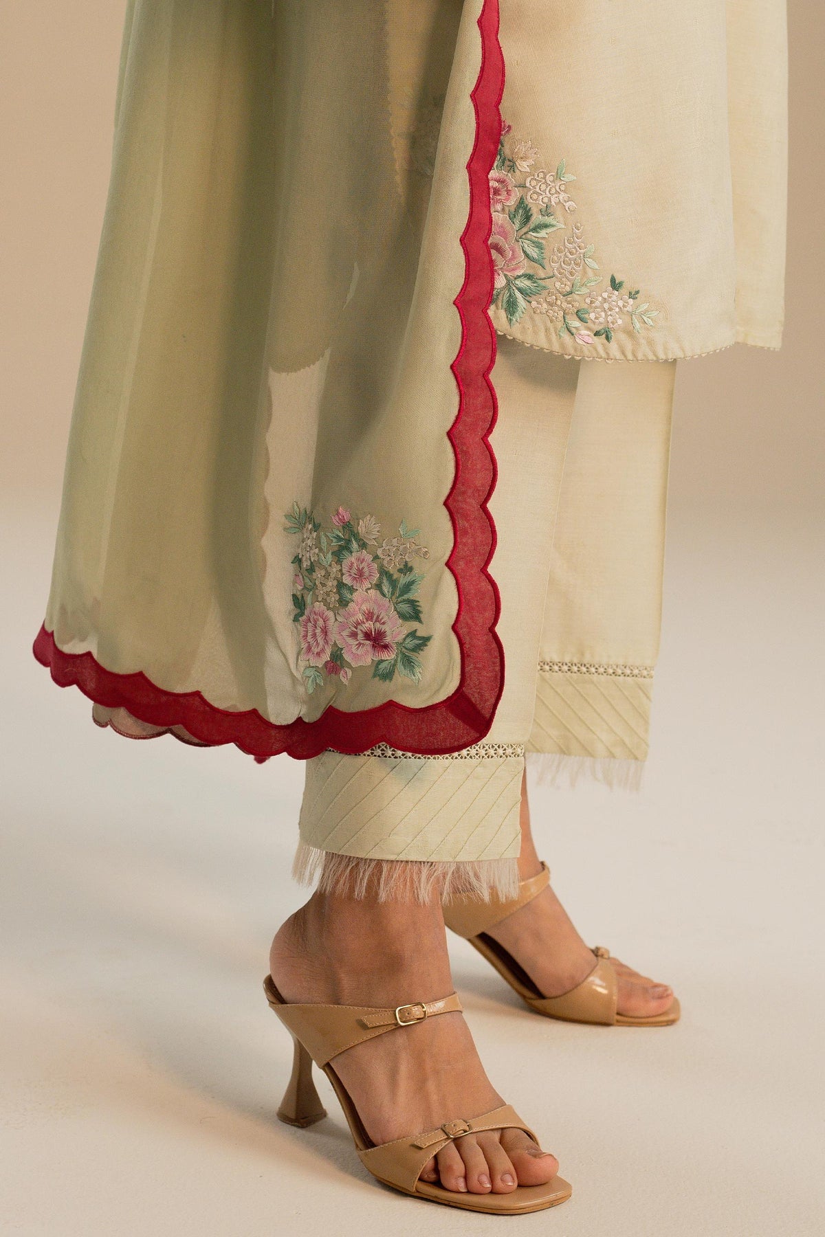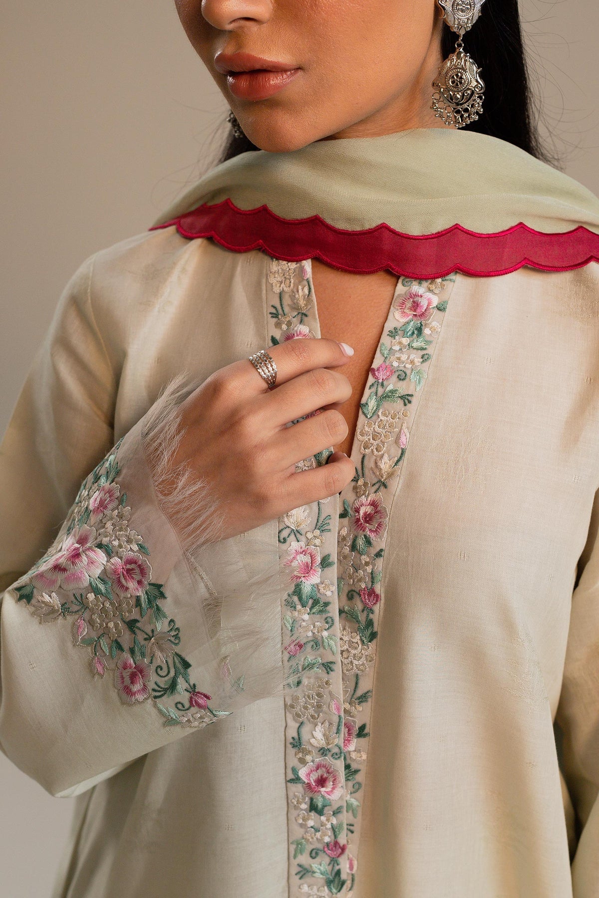 Our silvery sage loose-fit kurta features contemporary rose bunches on the shirt and paired with pin-tuck detail straight-fit pants. A cherry-red accent color is added to enhance the embroidered dupatta.