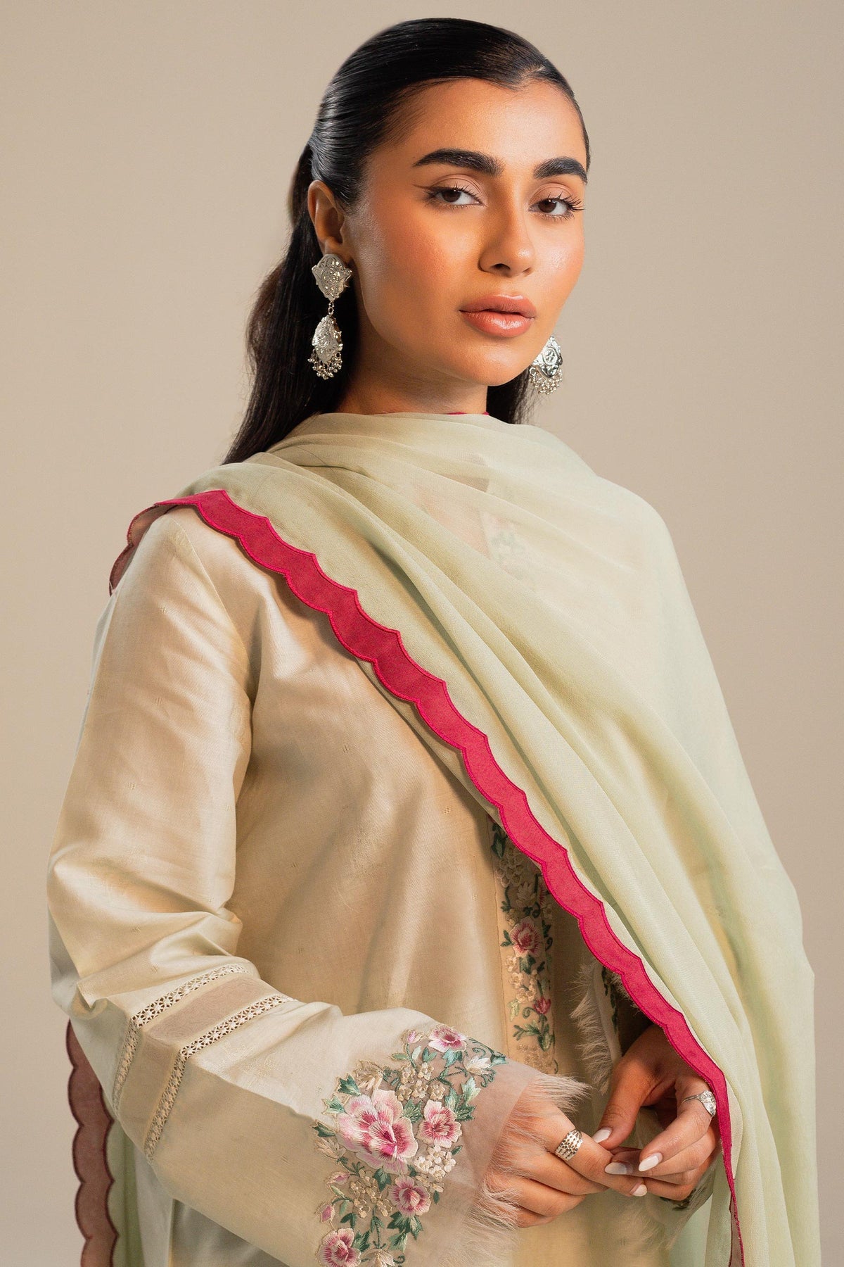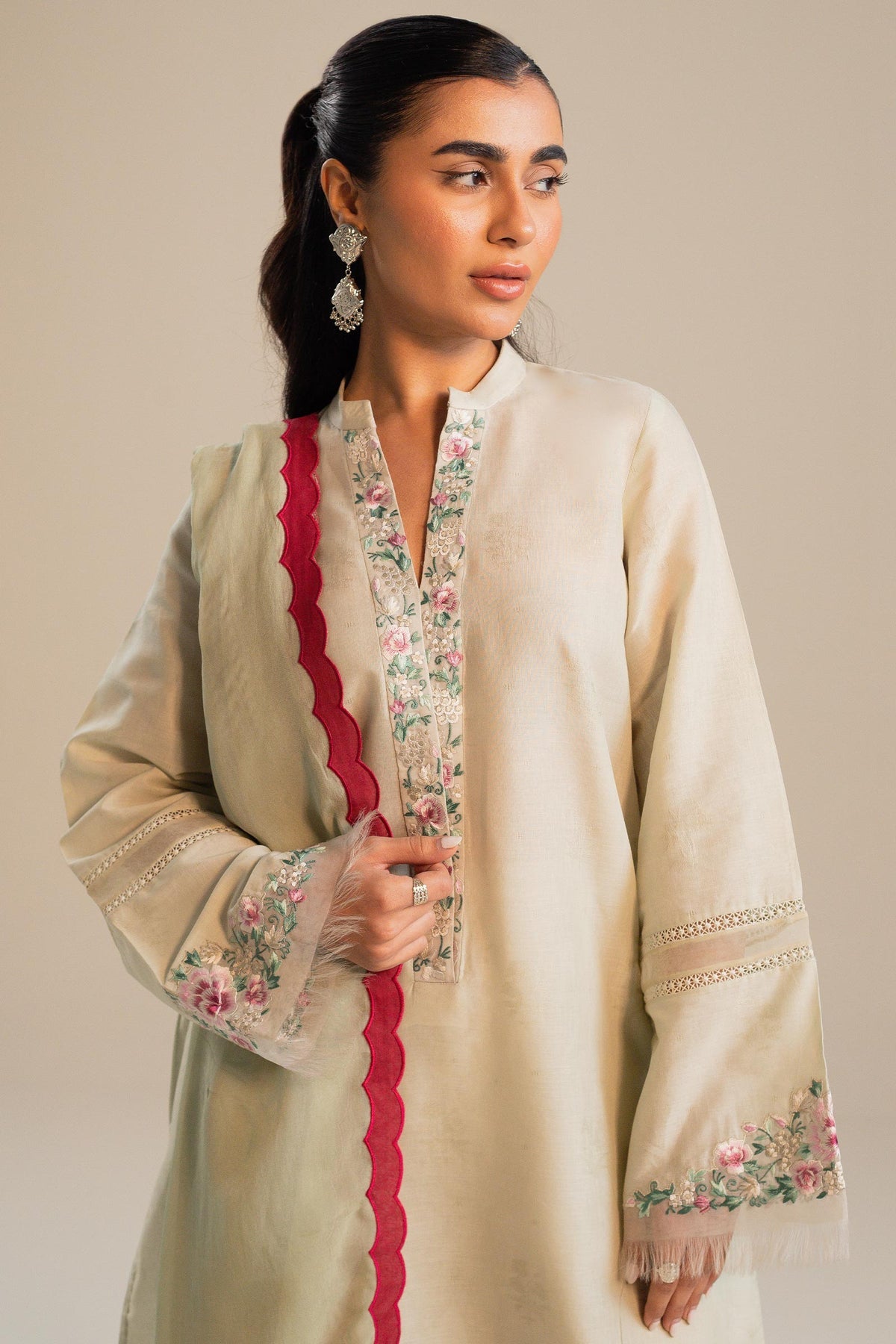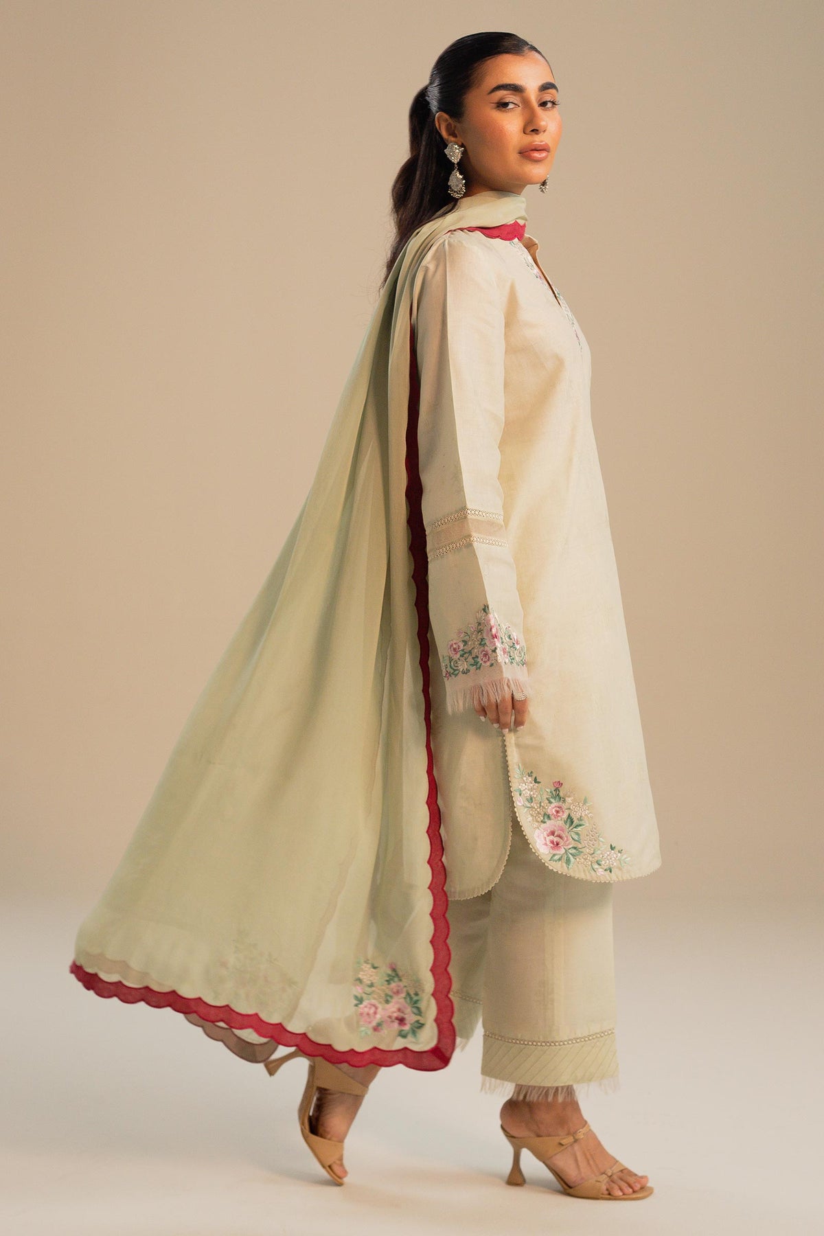 Our silvery sage loose-fit kurta features contemporary rose bunches on the shirt and paired with pin-tuck detail straight-fit pants. A cherry-red accent color is added to enhance the embroidered dupatta.
