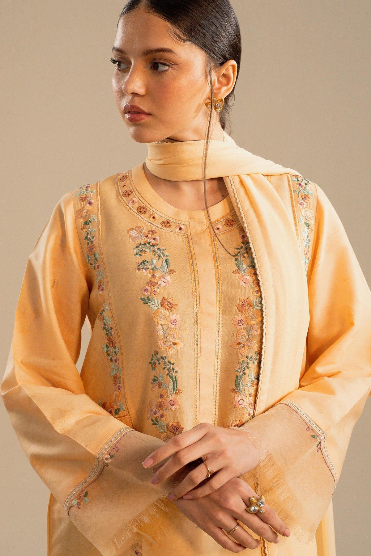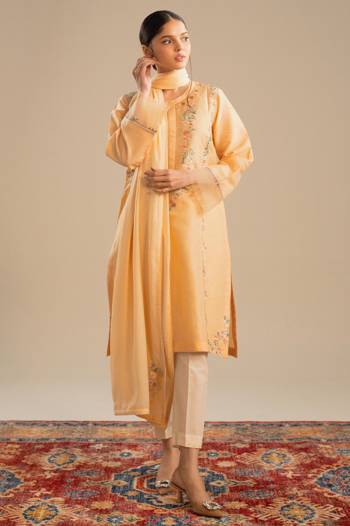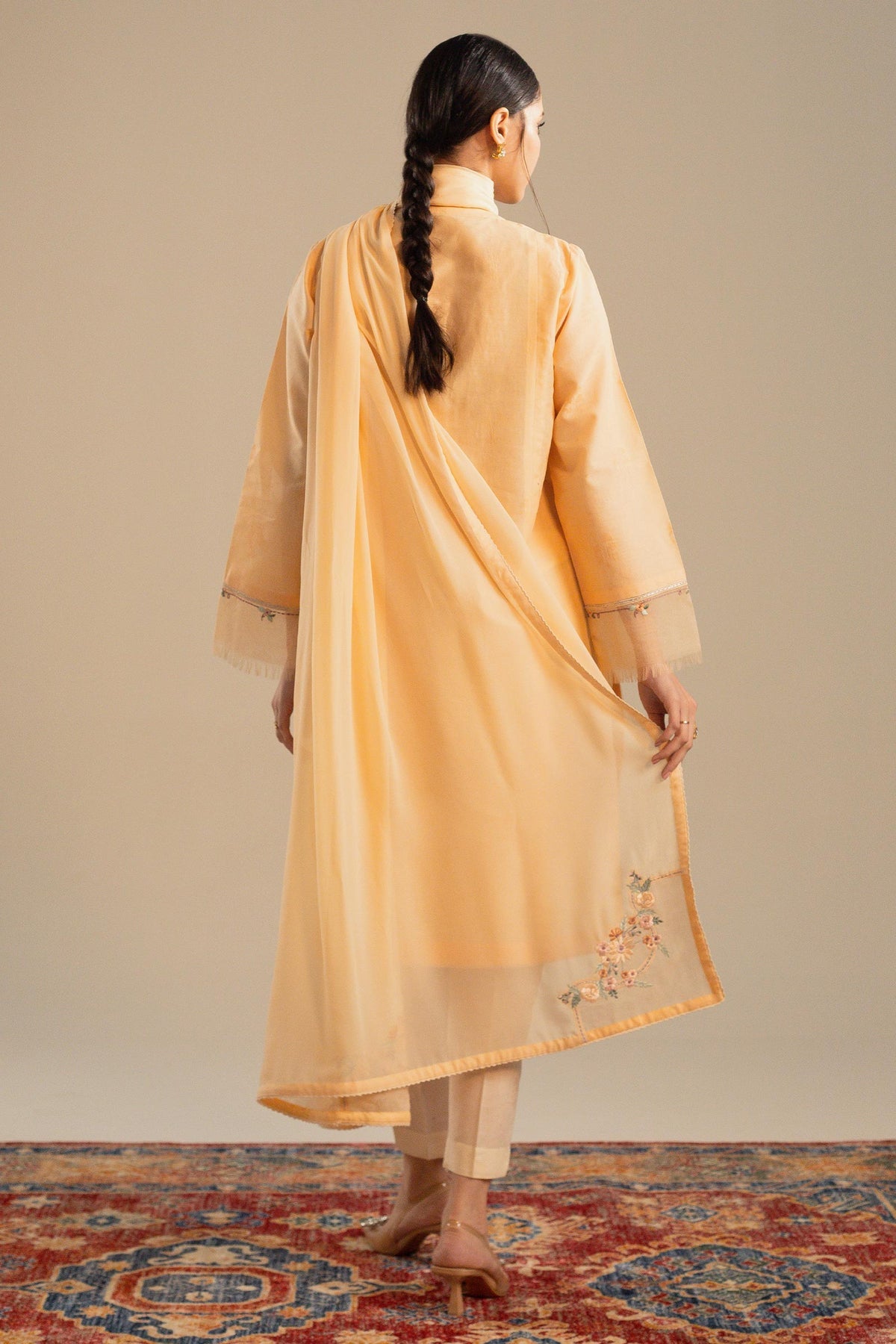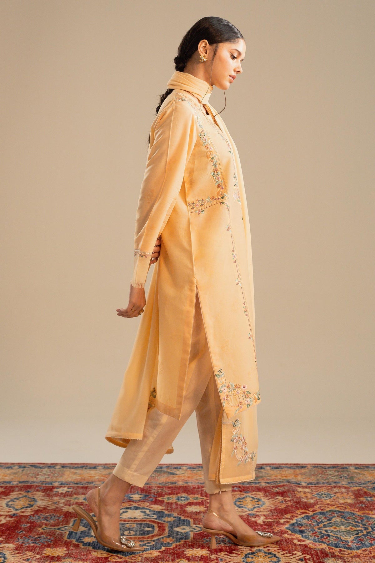 This airy buttercream paneled kurta is fully embroidered with floral vines and a combination of running stitches. Completed with cream-hued pencil pants and a complimenting embroidered dupatta.