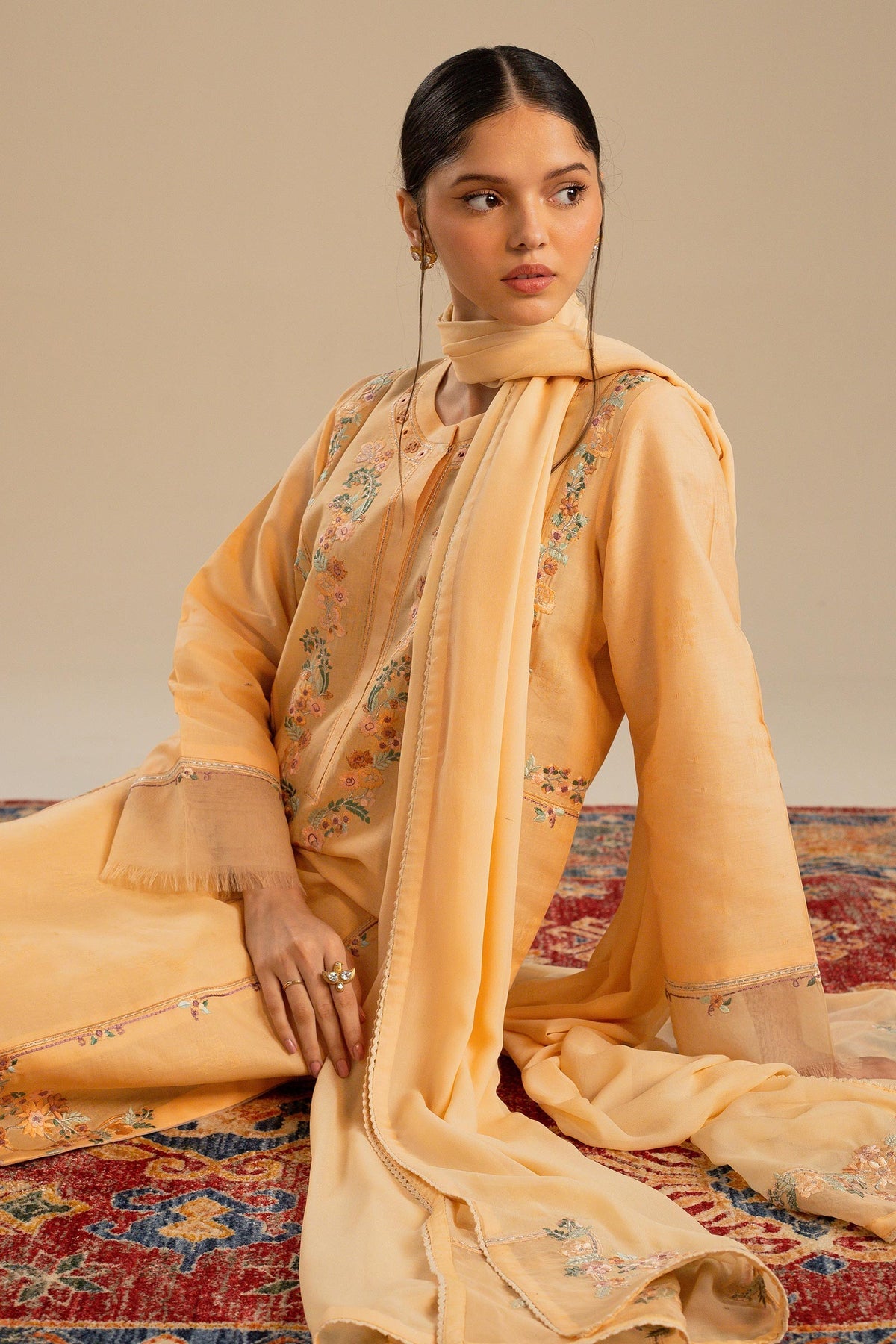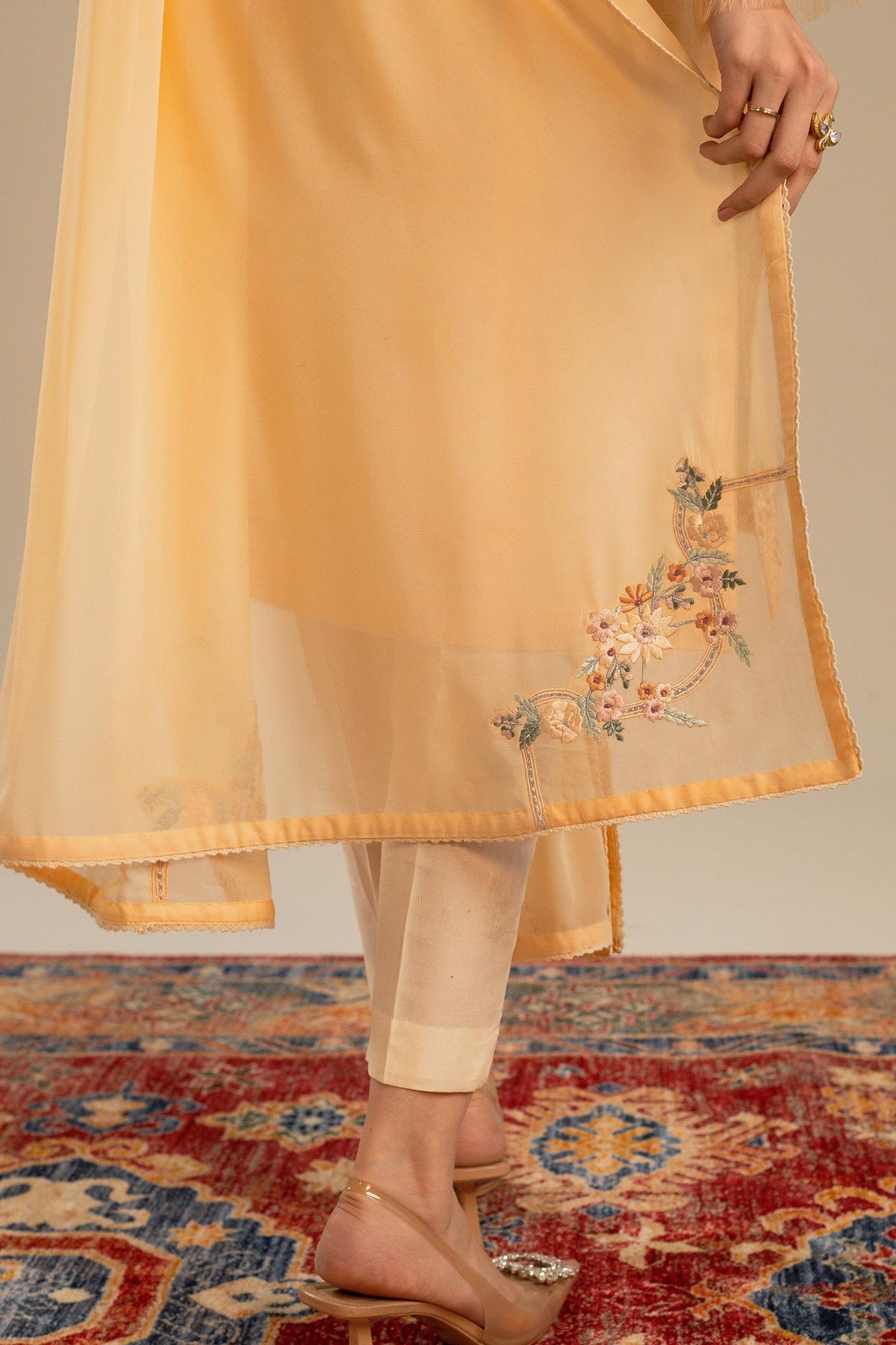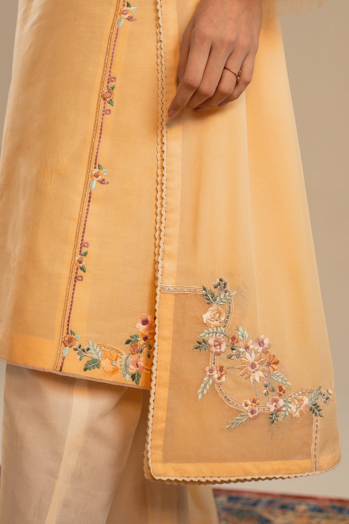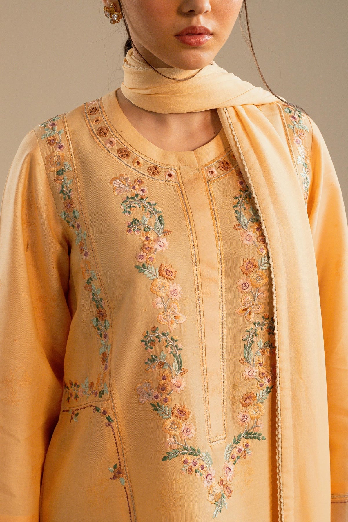 This airy buttercream paneled kurta is fully embroidered with floral vines and a combination of running stitches. Completed with cream-hued pencil pants and a complimenting embroidered dupatta.
