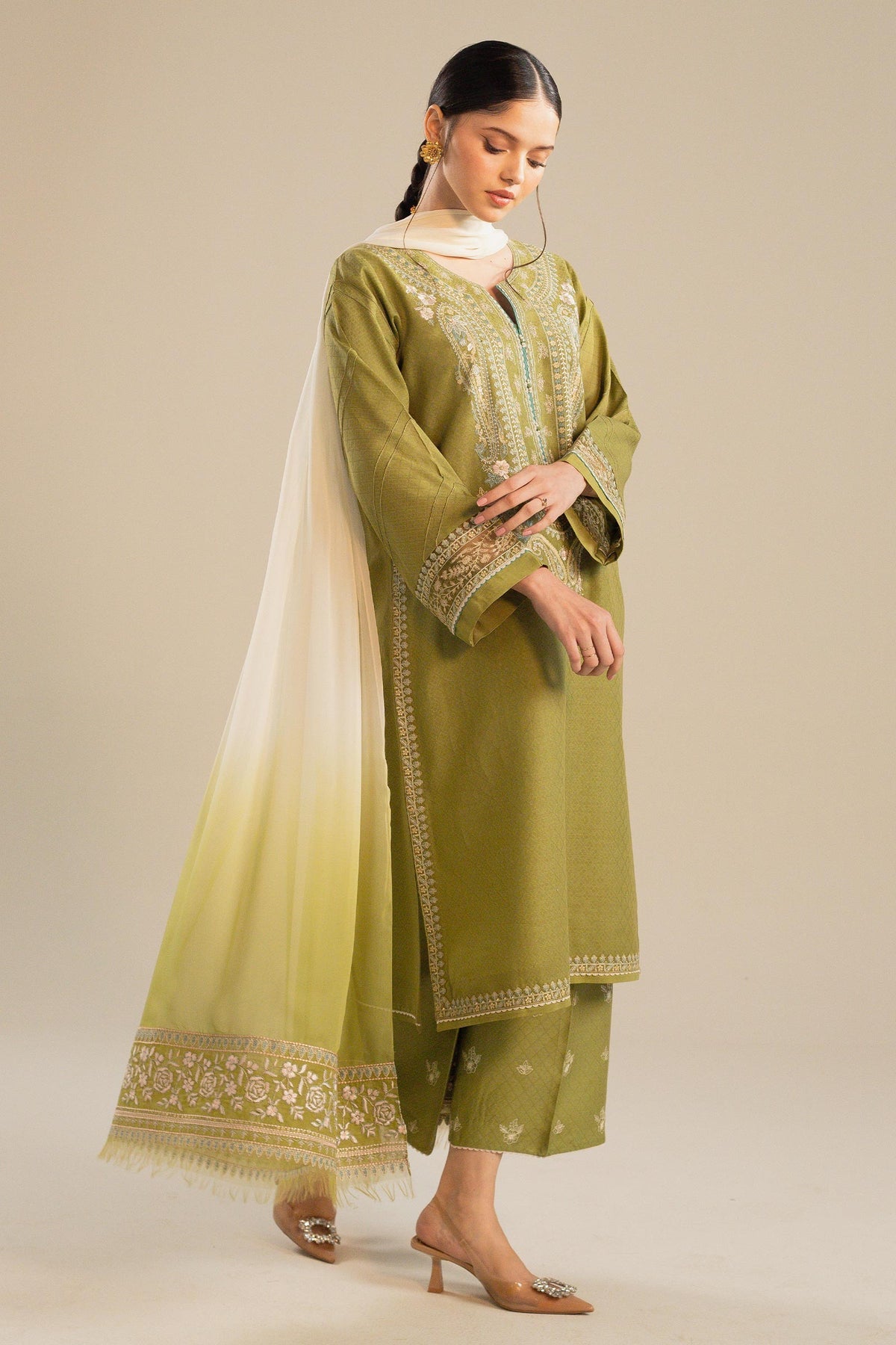 Our favorite look from our archives features embroidery inspired by Mughal florals and paisley. It is paired with floral embroidered izaar pants and set against a heavily embroidered ombre dupatta.