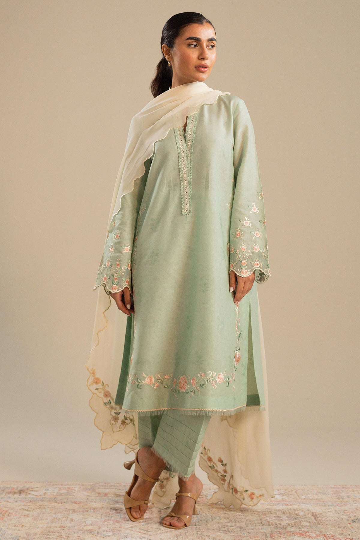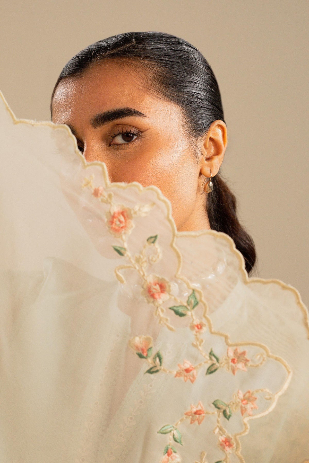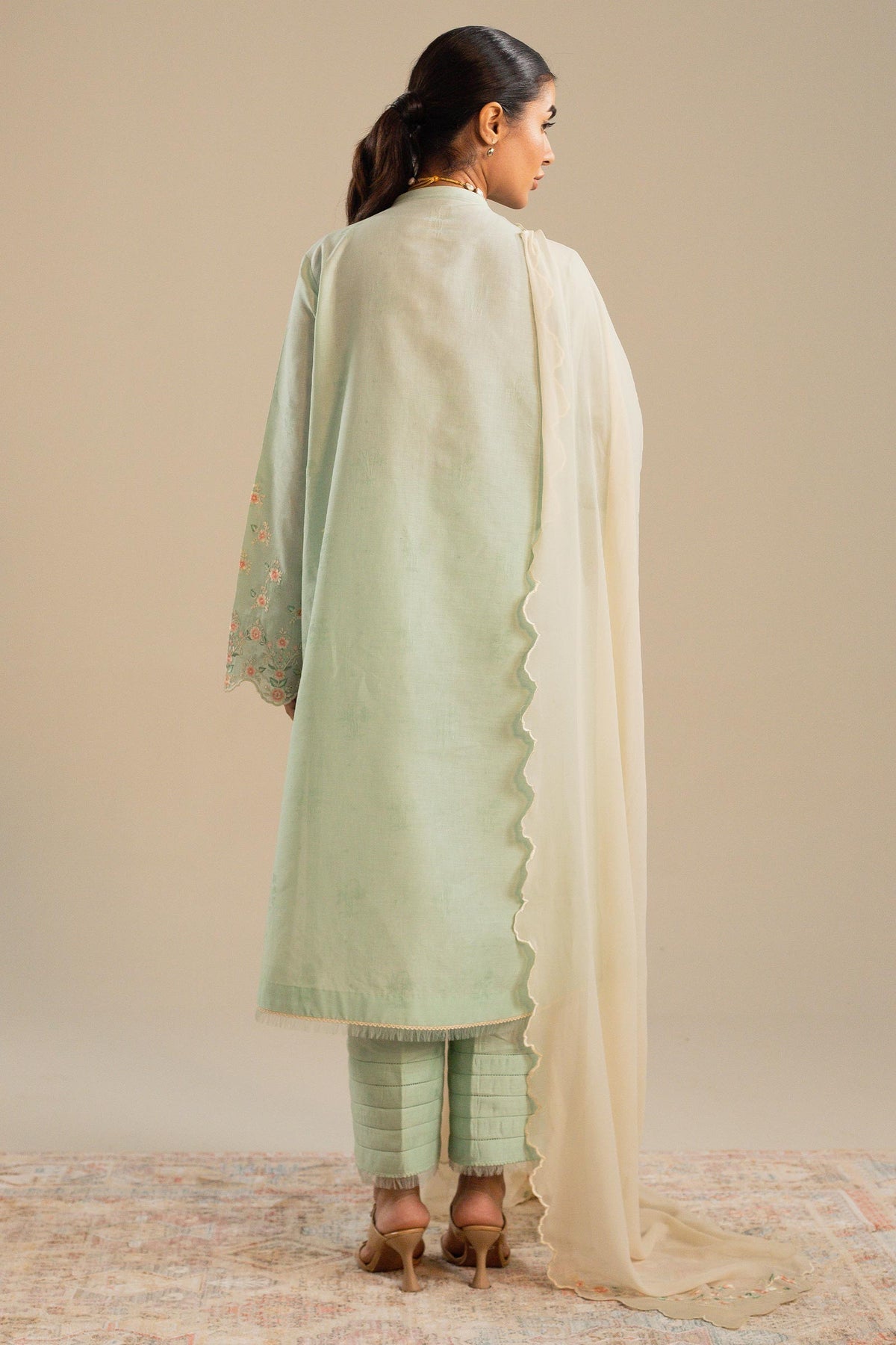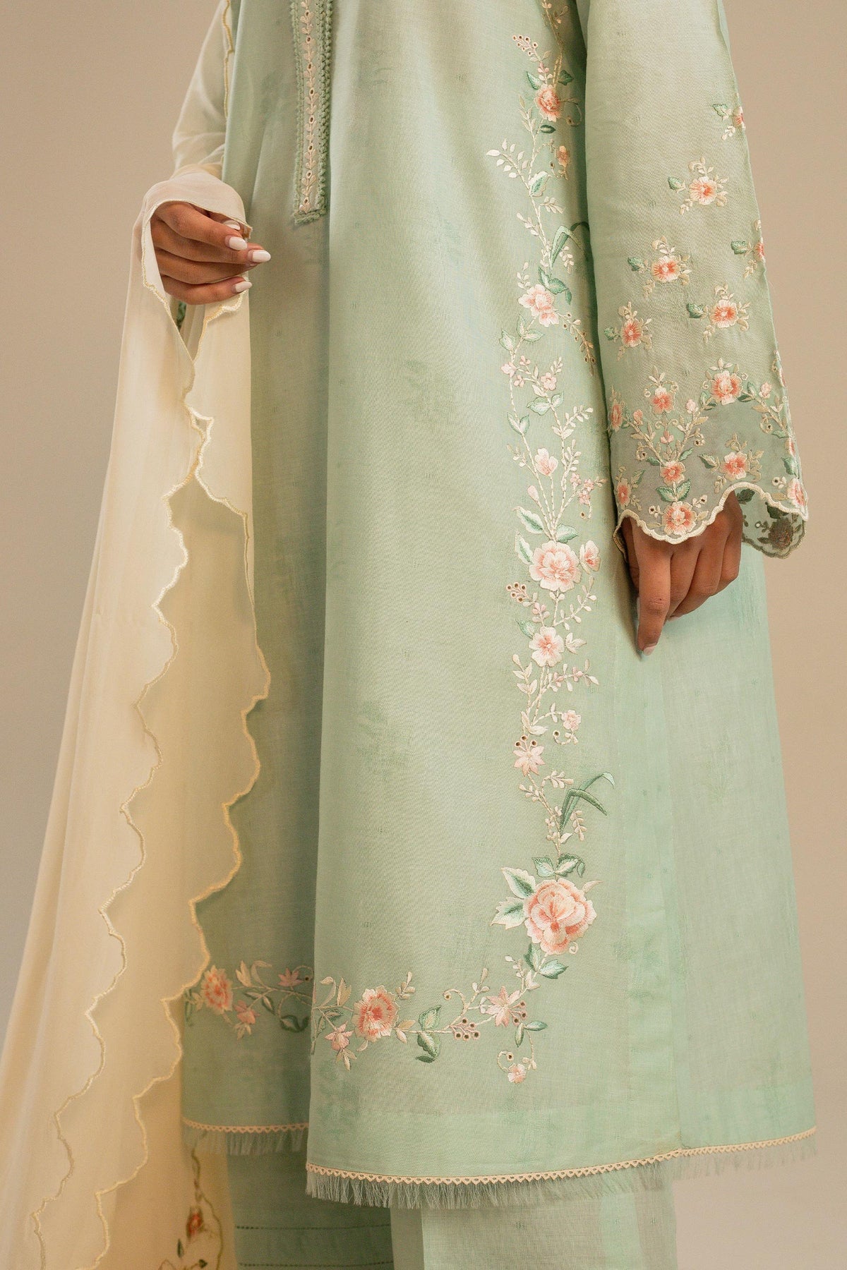 A cool Aqua loose-fit kurta inspired by antique french napkins and florals in hues of peaches and ivory is paired with lace-detailed straight-fit pants and a contrasting ivory embroidered dupatta on the corner.