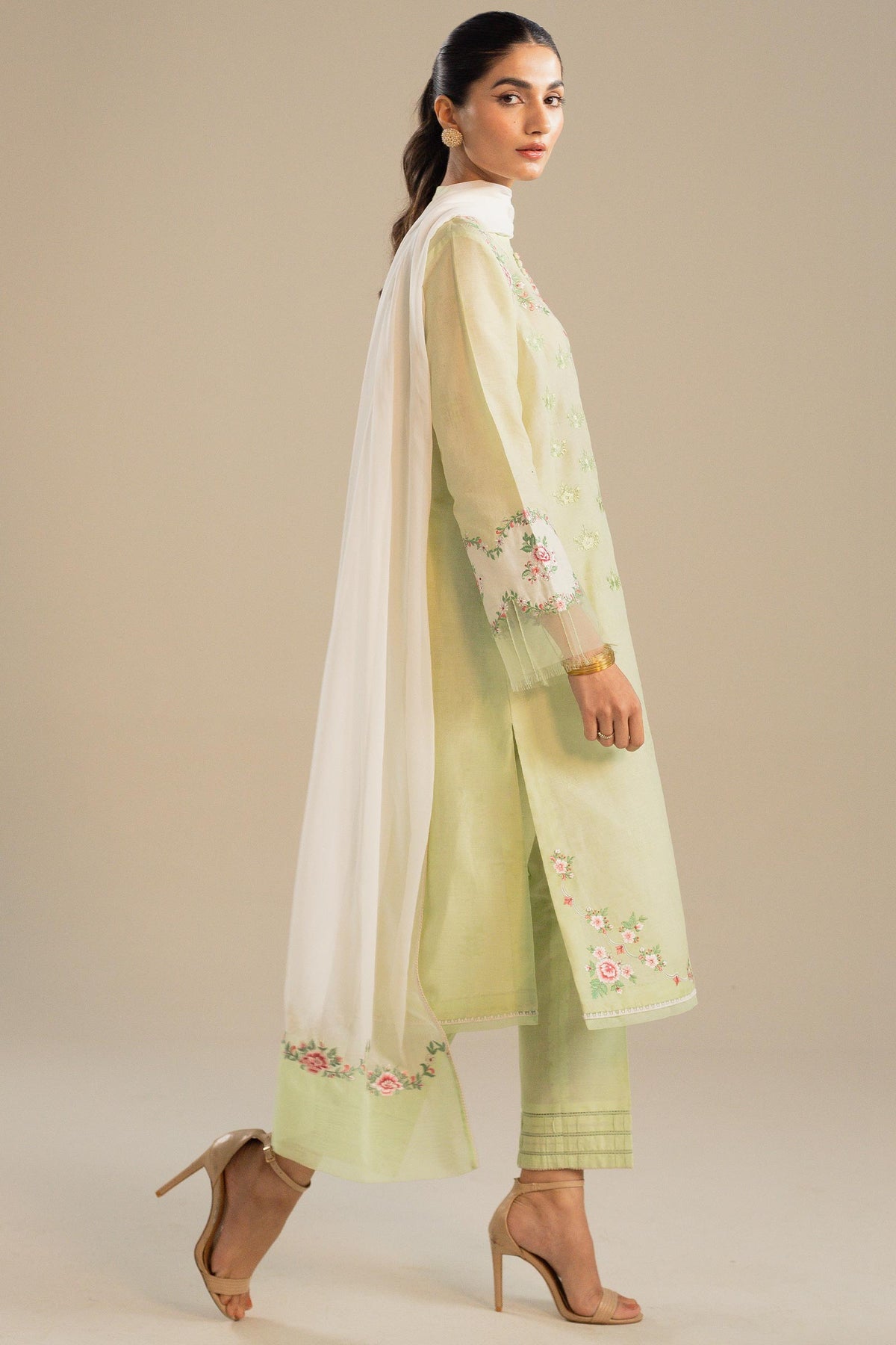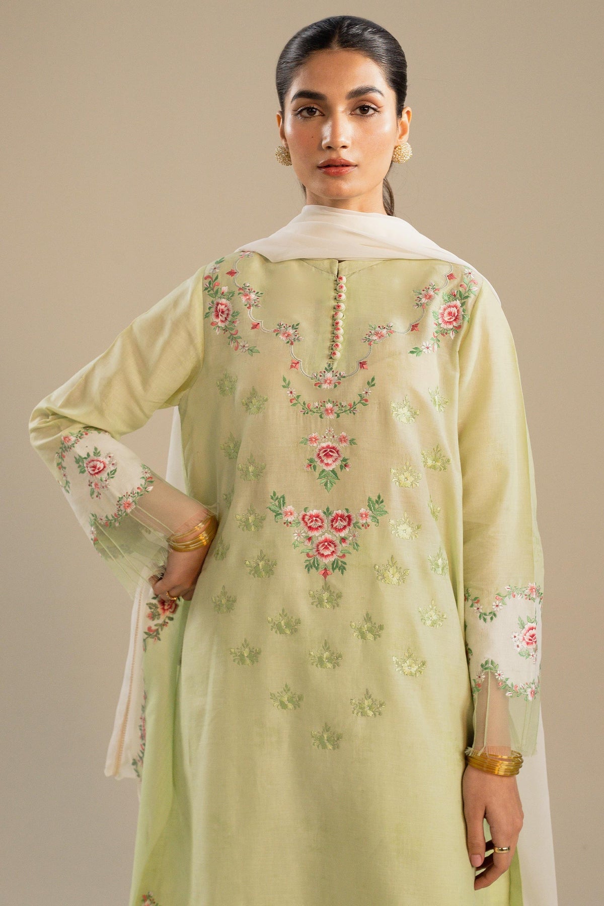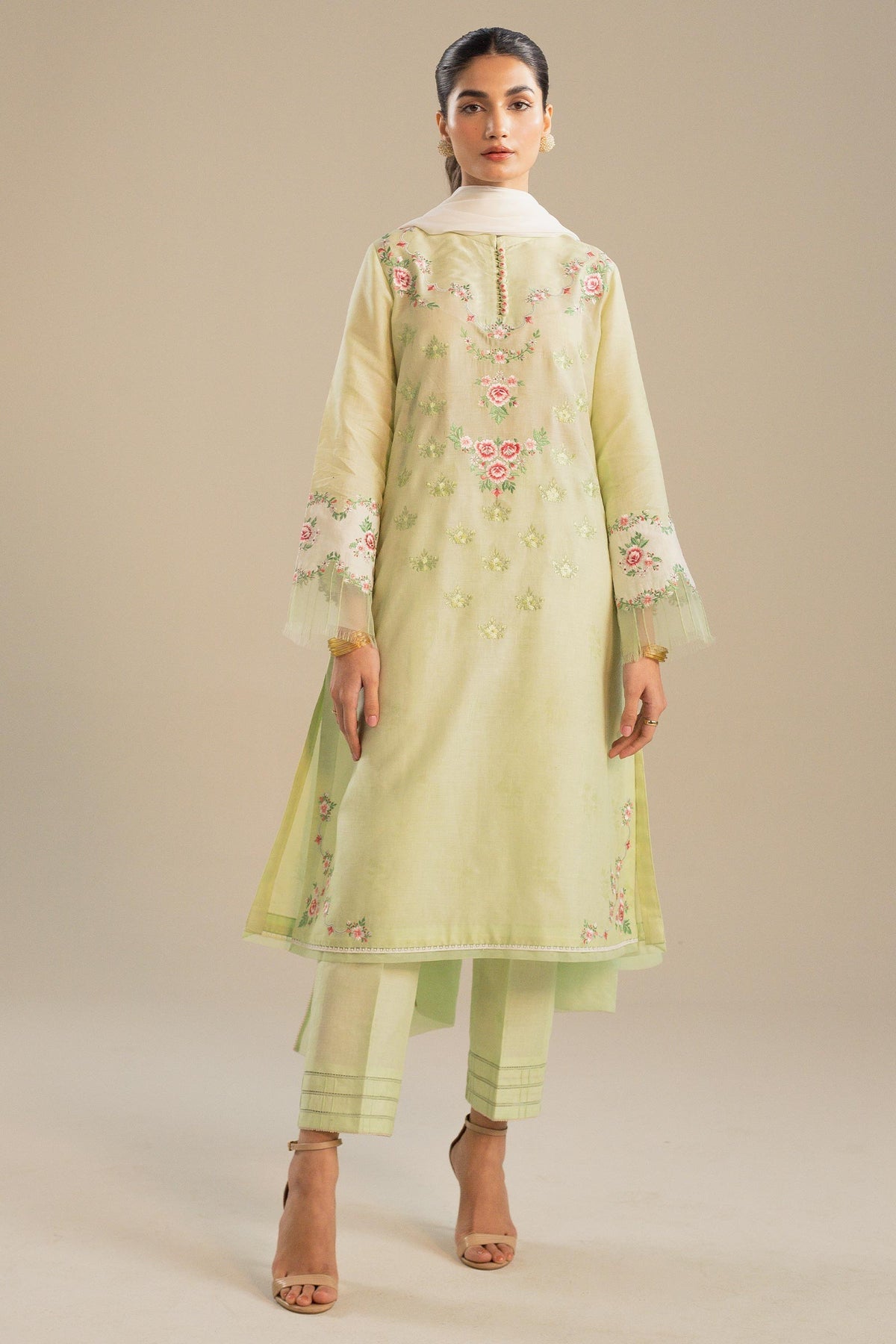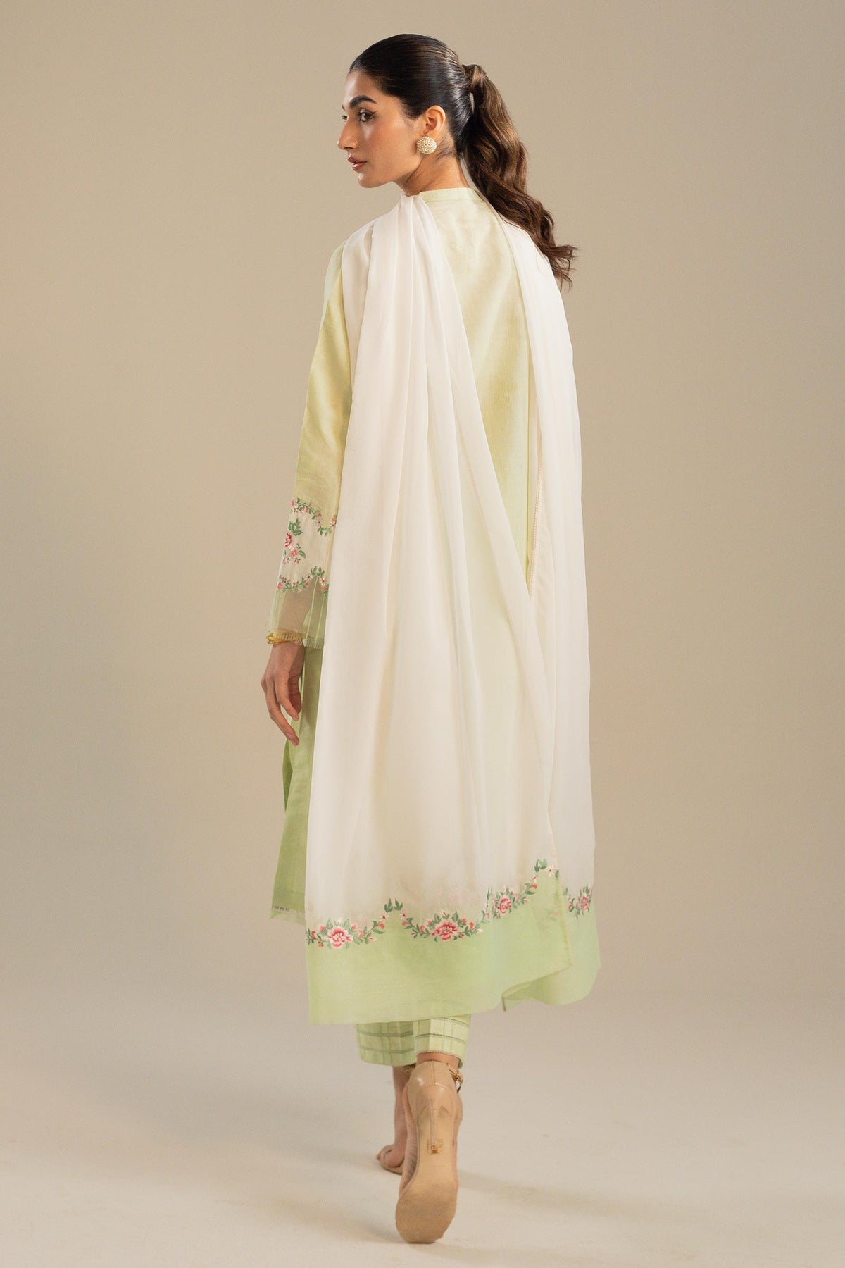 This ensemble features a long loose-fit kurta adorned with vintage english motifs and a playful border adorned with fabric manipulation on the sleeve. Styled best with our detailed tapered pants. Paired with green and ivory scalloped embroidery dupatta.