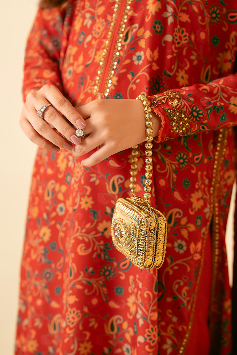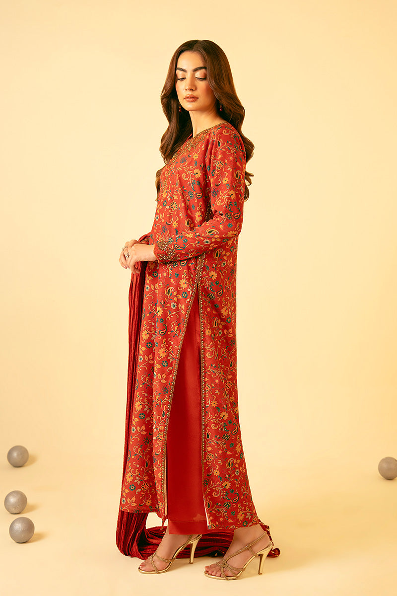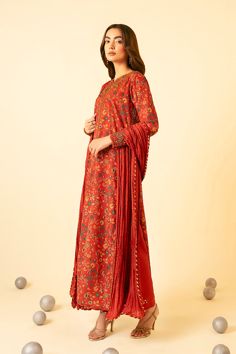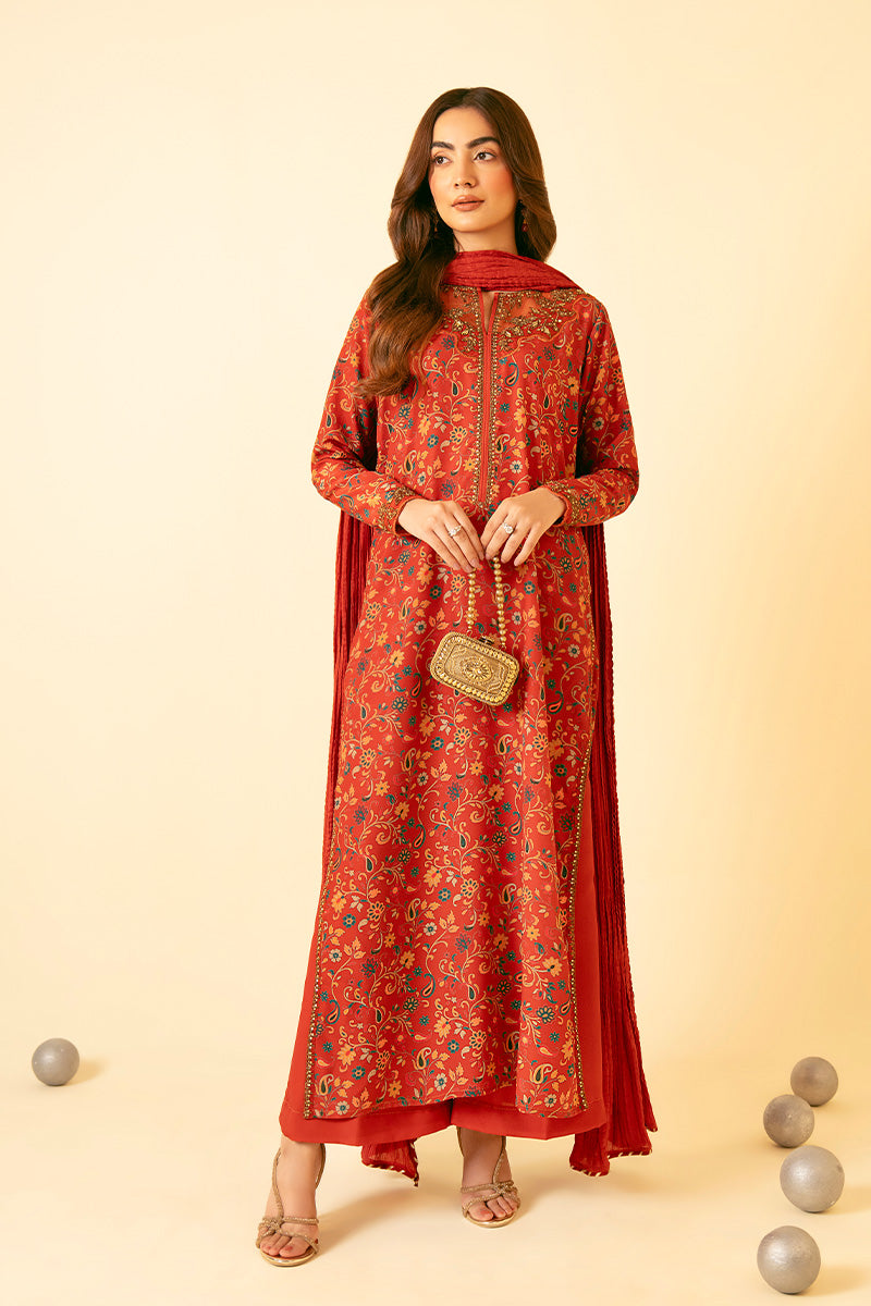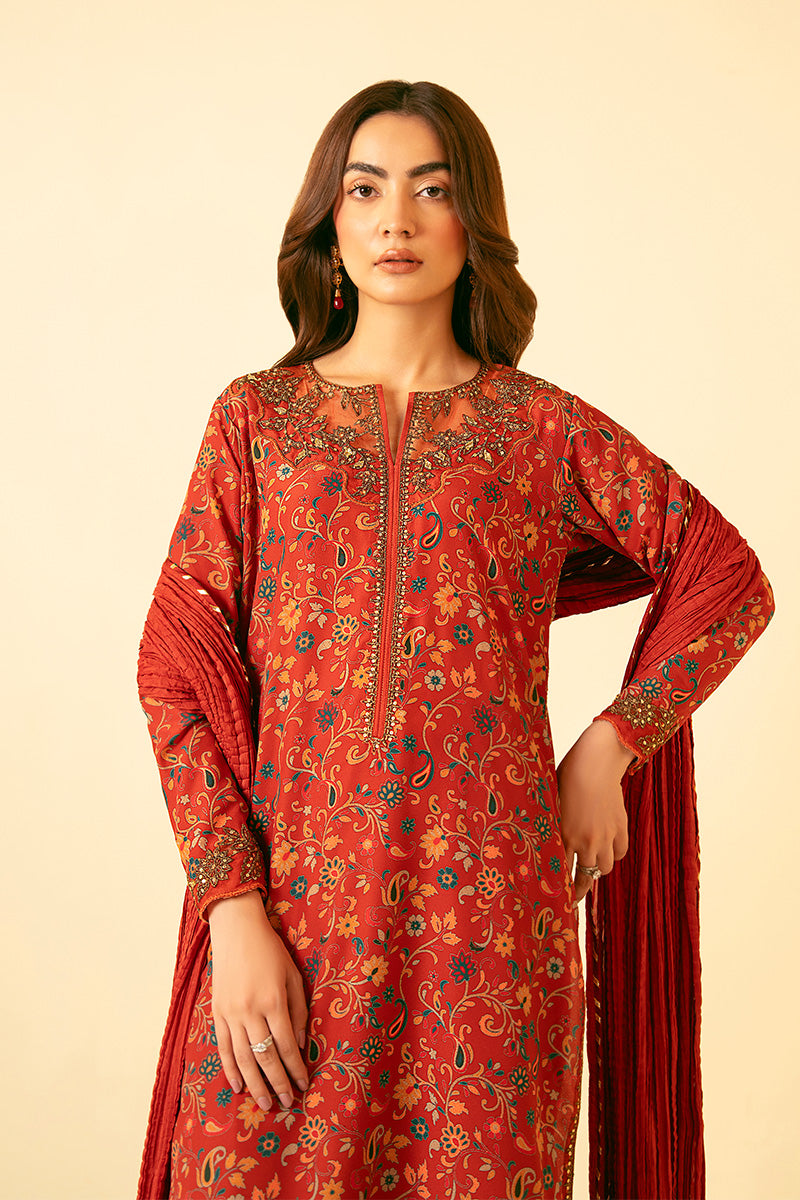 A masterpiece in modern tradition — this rust-toned ensemble redefines festive opulence. The straight long floral printed shirt, crafted in a richly hued base, features intricate embellishments along the neckline that glisten with artisanal finesse. The delicate handiwork trails across the sleeves and side seams, adding depth to the silhouette. Paired with straight pants for a clean, elongated look, it is complemented by a crushed dupatta edged with heavily embellished borders — completing the outfit with an effortless grandeur.