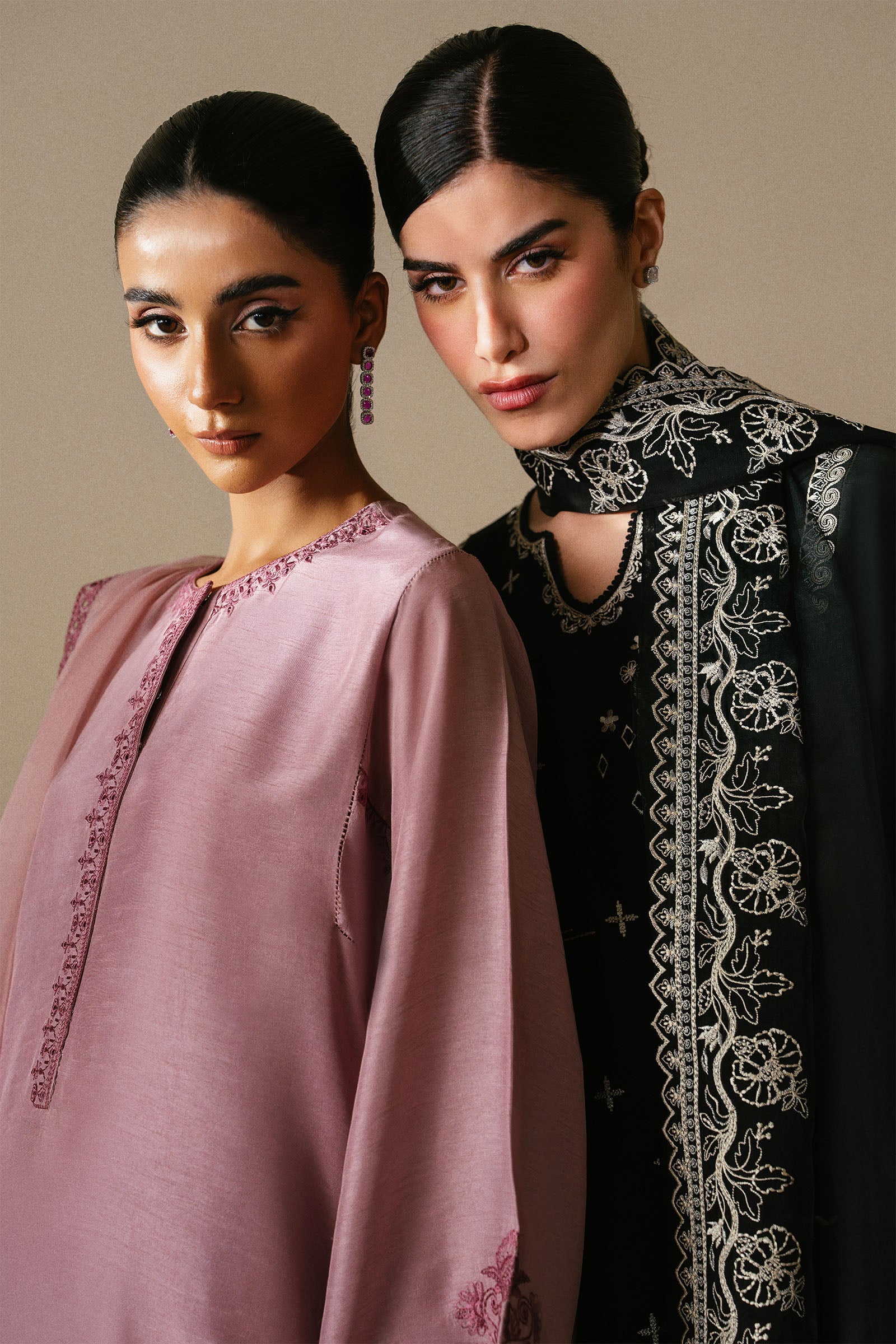 Bathed in the soft glow of dusk, Florayne unfolds on a mauve raw silk canvas, blooming with delicate floral and paisley embroideries that whisper of romance and quiet grace. The short shirt, adorned with intricate hemline motifs and sleeves finished with playful tassels, feels like poetry in motion. Paired with a tapered shalwar edged in fine embroidery and an airy organza dupatta graced with paisley-embroidered pallus, the ensemble flows with ethereal femininity. Dreamy, delicate, and endlessly elegant — Florayne captures the essence of fall’s floral reverie, where every thread breathes softness, and beauty blooms effortlessly.