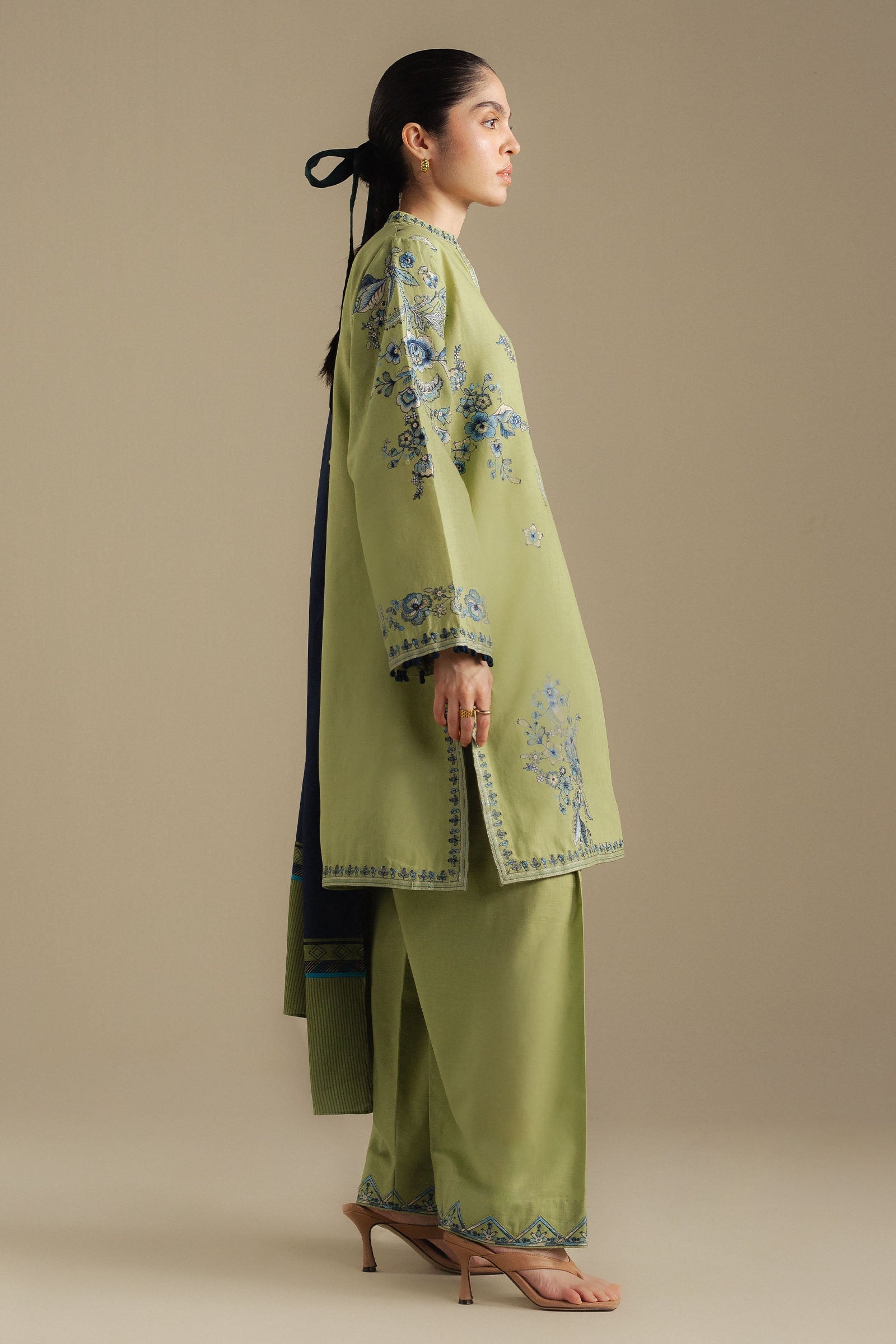 An apple green khaddar shirt and trouser paired with a shawl in apple green and blue, a fresh, lively mix that carries winter brightness with ease.